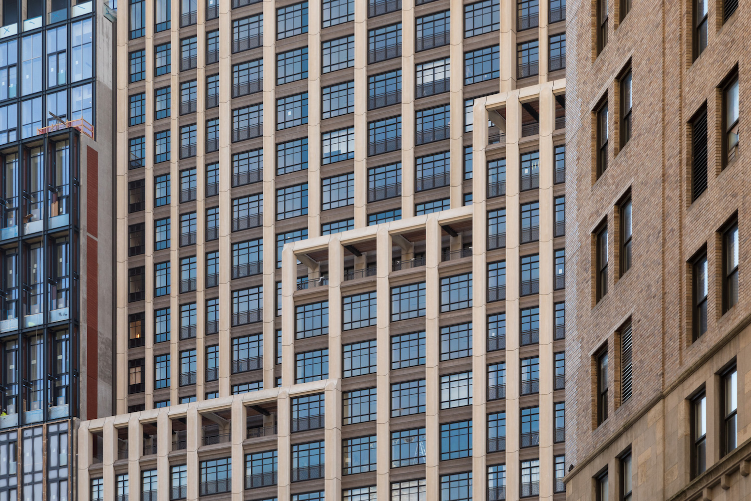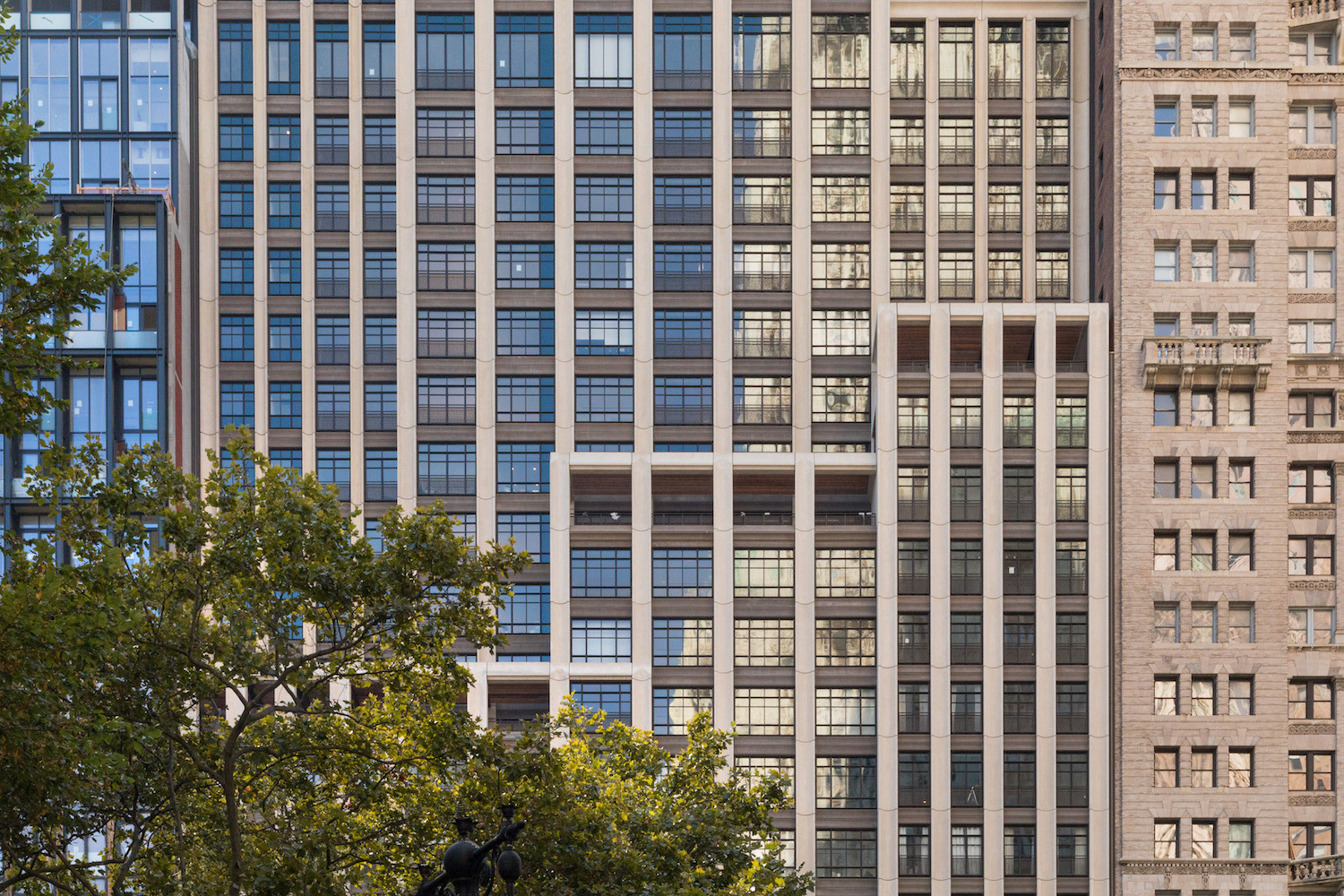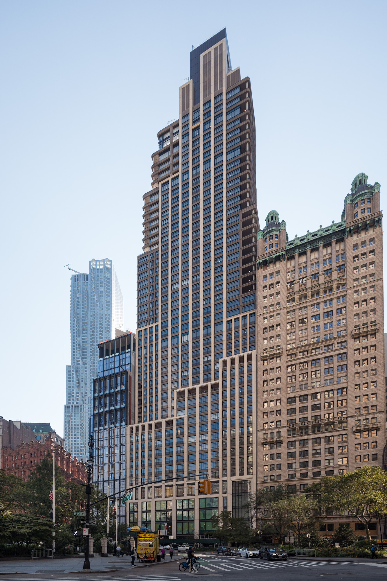 The 50-story tower is located adjacent to City Hall Park and stands in close proximity to some of Manhattan’s earliest and best-known skyscrapers, including Cass Gilbert’s Woolworth Building, McKim, Mead & White’s Manhattan Municipal Building, and R.H. Robertson’s Park Row Building. While designed in myriad styles, the historic skyscrapers in the area are all renowned for their rich masonry and metal ornamentation, and captivating historicist features ranging from flying buttresses to an iteration of the Choragic Monument of Lysicrates.