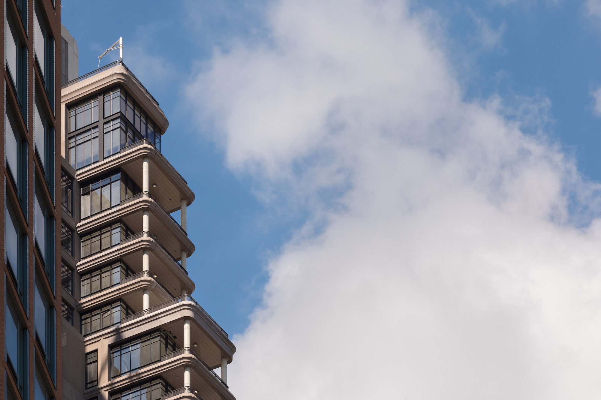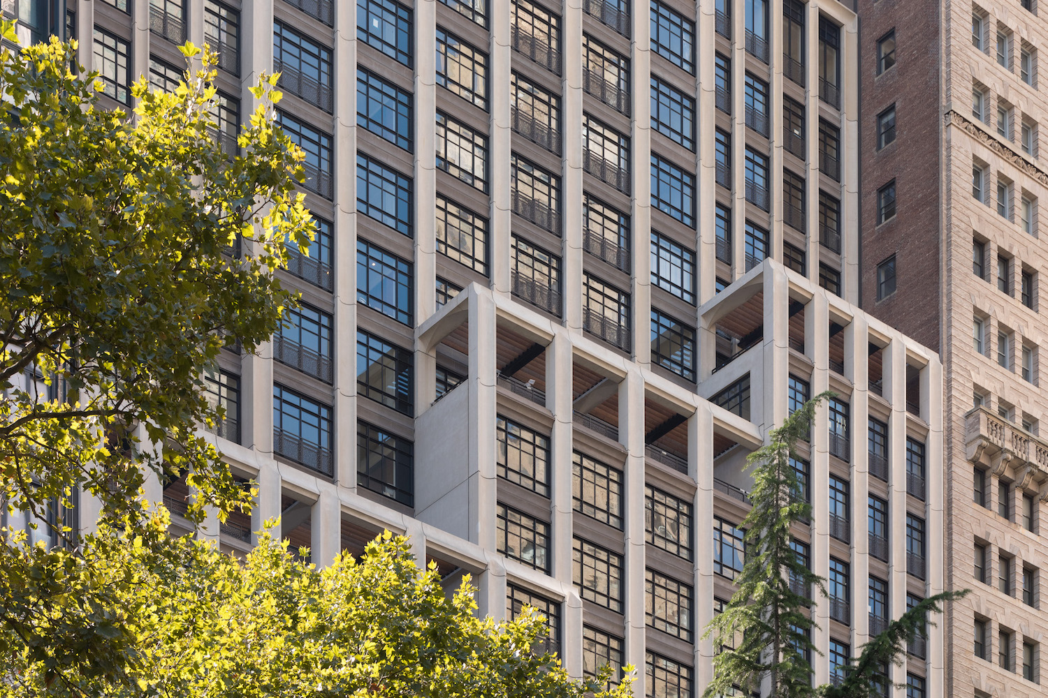 Rather than imitate the old, COOKFOX’s design for 25 Park Row hits on the key points of turn-of-the-century skyscraper design: The concave concrete panels yield a substantial degree of depth to the facade and the resultant play of light and shadow, while biophilic metalwork bears a relation to surrounding ornamental filagrees. The formidable heft of the tower is extenuated through a series of setbacks topped with loggias, which form something of an Olympian stairwell overlooking City Hall Park. Additionally, the tower tapers as it rises and the corner balconies curve in a Streamline Moderne-like flourish.