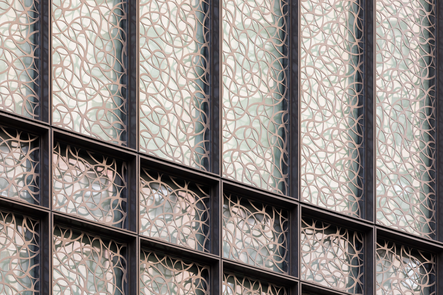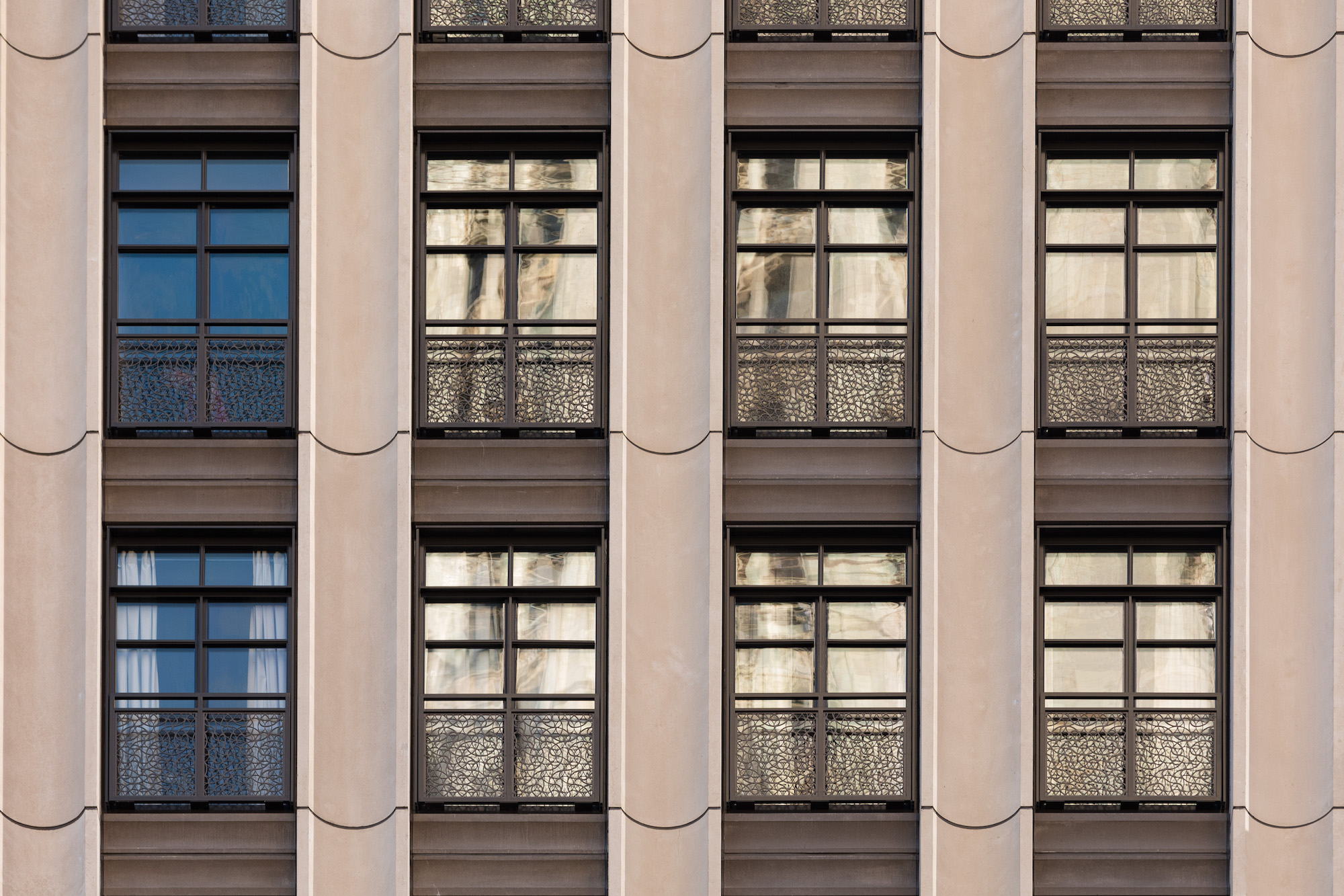Artex Systems, an Ontario-based manufacturer, fabricated the precast components of the curtainwall modules; the concave concrete light-brown spandrels and off-white piers. Collaboration between COOKFOX and Artex began at the onset of the design process. “There was close collaboration as part of the design assist process, but the relationship also informed how we would integrate the construction sequencing, joint spacing, and reveals into the design,” said COOKFOX partner Brandon Specketer. “The final curvature was a design element we were able to see remain relatively unchanged from concept through fabrication and installation, and that back and forth working relationship also informed the railing pattern and final finishing.”