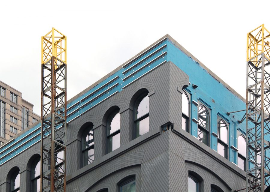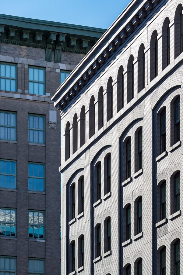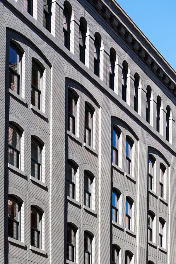 The project team used a combination of laser scanning and hand measurement to capture details in the base, middle, and top of the historic masonry facade. The base of the facade mimics it’s neighboring limestone masonry, employing a marine grade aluminum panel with CNC-milled patterns. The material is finished with a plasma flame spray involving a mixture of nickel and stainless steel powder. The cost of this premium material and finish limited its use to the ground floor of the building where it’s exposure is maximized to passersby.