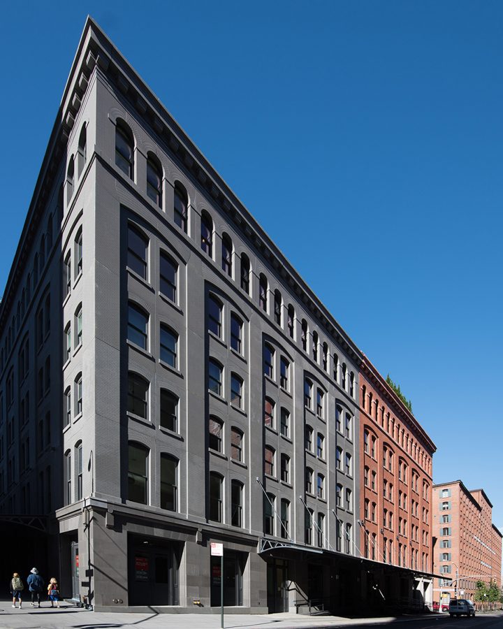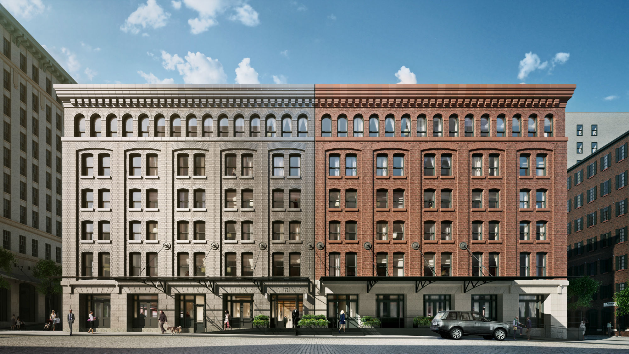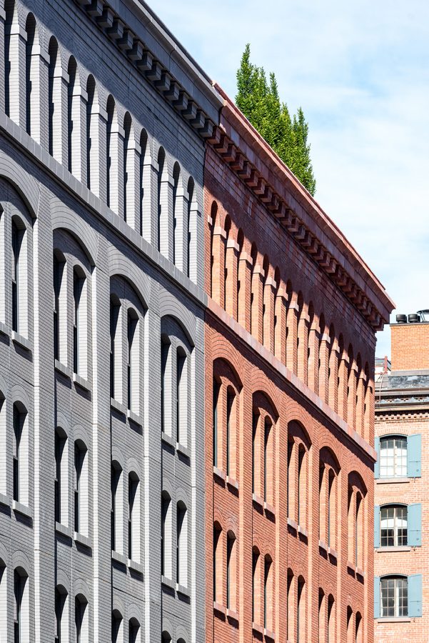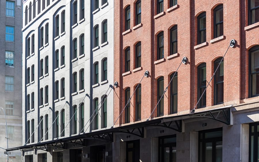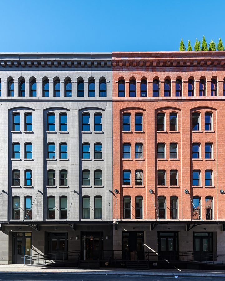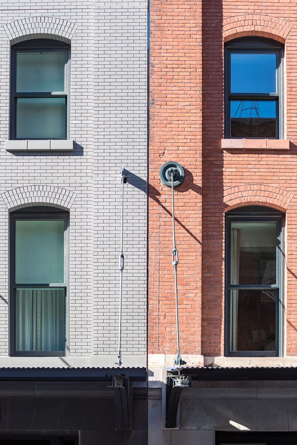 Wesley Wolfe, director of design at New York City–based Morris Adjmi Architects, said this concept of the direct copy was influenced by both contextual and cultural factors. “Warehouses in the district often were extended as their needs for more space grew. These additions would often mimic the style of the original warehouse.” Wolfe said the use of analogous materials is not uncommon, citing the tendency of industrial-era cast iron to replicate stone or brick. The project was also inspired by art and the idea of duplication in the work of pop artists like Andy Warhol.