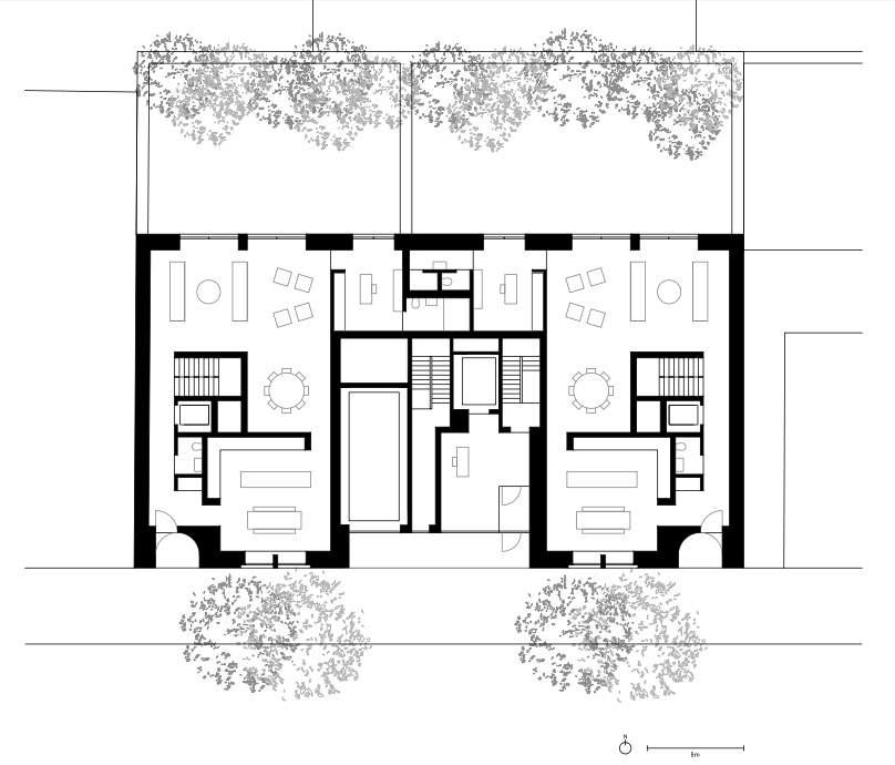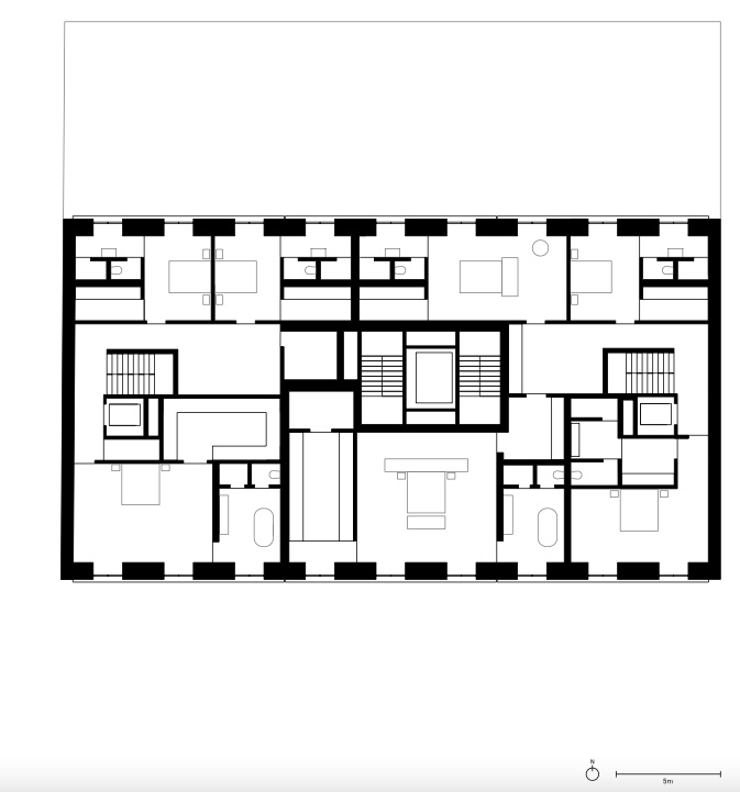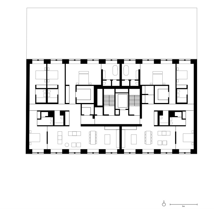 Across floors, the varying rhythms of the doors and windows recall a superposed order, common in Roman and Renaissance architecture, in which successive stories of buildings have different orders, progressing from heaviest at the bottom to lightest at top. The use of concrete on the ground floor conveys a sense of solidity and strength and gives “a strong sculptural presence,” according to the design team, while the thin mullions of the fifth story appear more delicate. From across the street, the concrete on either side of the recessed townhouse entrances appears as load-bearing columns. The penthouse on the upper level departs from the logic of the superposed order; it features large, wide windows and higher ceilings and is constructed of concrete that continues from the cornice, but it is setback from the street and obscured from passersby along the sidewalk.