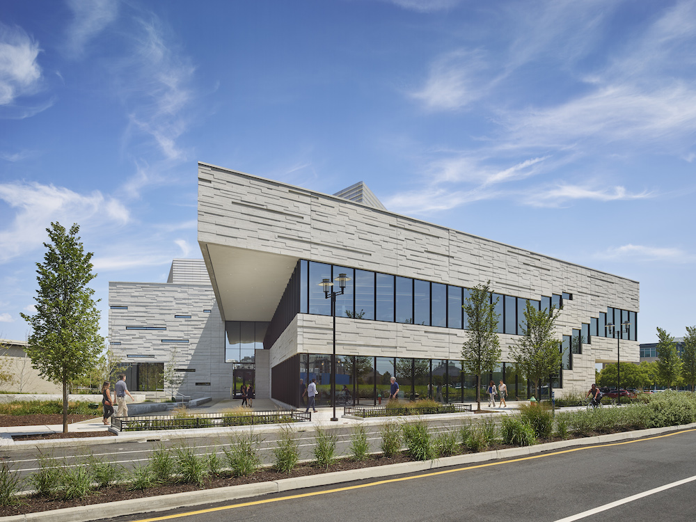 The Philadelphia Navy Yard, similar to other waterfront areas across the country, is undergoing a two-decades-long transformation from a declining industrial district to a burgeoning office park. A significant number of businesses have located to the adaptively reused warehouses, while others are opting for entirely new construction. 351 Rouse Street, which is the U.S Headquarters of medical research laboratory Adaptimmune, is a recent addition to the area designed by architectural firm DIGSAU and clad in prefabricated concrete panels.