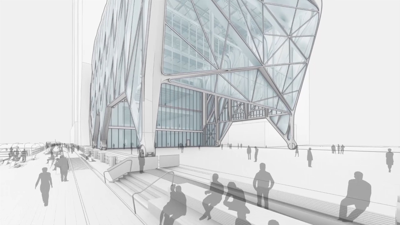 The Shed adjoins DS+R and the Rockwell Groups adjacent 15 Hudson Yards along a seam of polished steelwork. Many of the mechanical components of the performance space are embedded within the podium of the tower, ventilated by parametrically designed glass-and-louver modules.