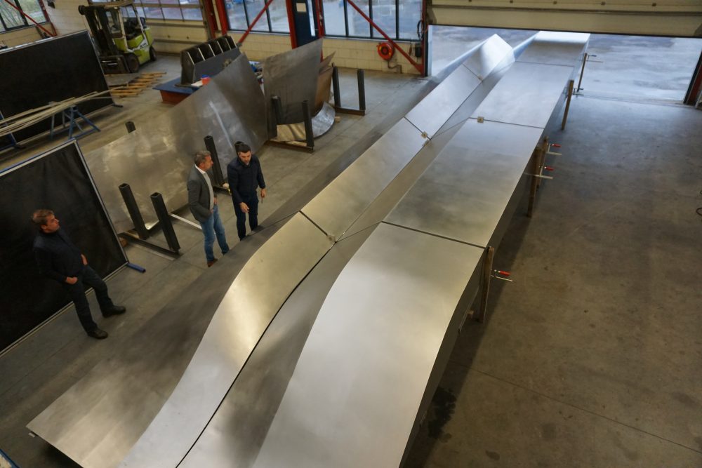 Beginning at the 20th story, the tower dramatically curves using a cold-warped unitized glass curtain wall system. The individual glazing units, produced by German manufacturer Interpane, were cold-warped on site. To warp the glass components, the panels were held in trapezoidal frames with silicone seal joints that anticipated the final form of the panels once they were bent into place. While early renderings of the project depicted 15 Hudson Yards with anatomical undulations, cost constraints and manufacturer warranties straightened the design into its current form.