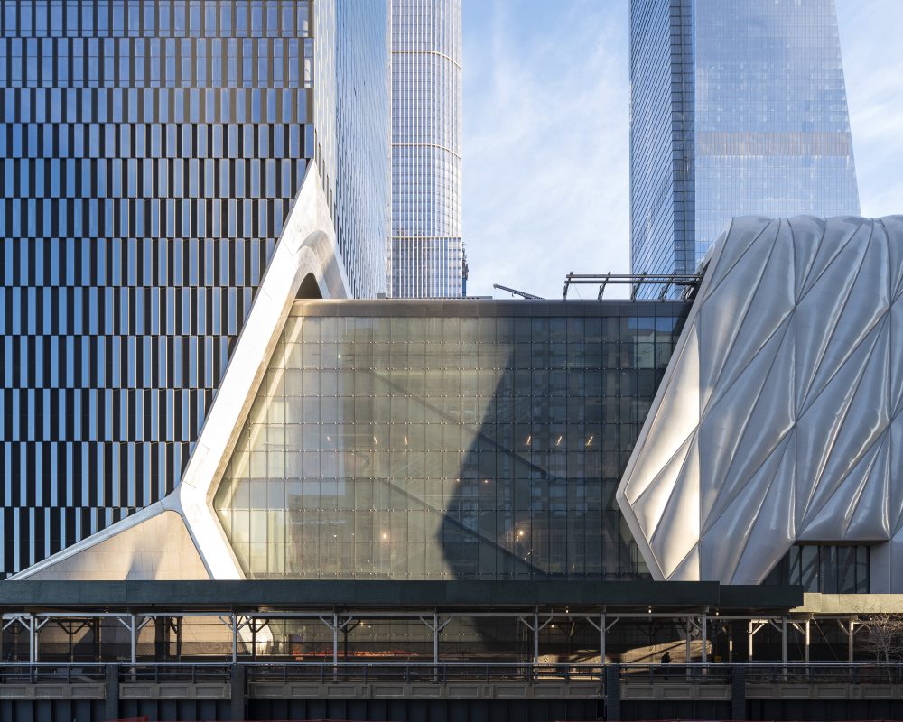 The Shed, also designed by DS+R, adjoins the smooth limestone surface of 15 Hudson Yards along a diagonal seam defined by polished and formed steelwork by CIG Architecture. Incorporating the dynamic performance arts space into the base of the tower presented a number of mechanical and structural challenges for the design team. The 48.7-inch-wide modules all have both a glass and ventilation louver component. The designers varied the ratio of the two pieces parametrically to best ventilate interior mechanical equipment, with the widths of the louvers ranging from 4 to 31 inches.