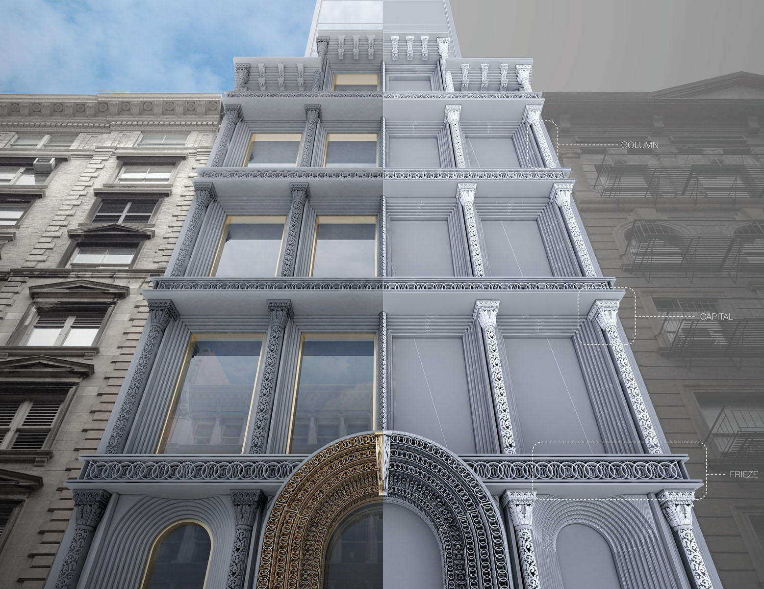 The research implications were amplified once edg understood how to apply it. When it learned of the impending demolition of 574 Fifth Avenue, a 1940 building with intricate ornamentation, edg turned the project into a case study, a perfect prompt for thinking of alternative ways to restore and maintain deteriorating ornamentation. Conducting its fabrication work on a rooftop near its New York office, edg exhaustively explored materials and mold thicknesses until the team arrived at what it considered to be the right combination of material cost efficiency and strength.