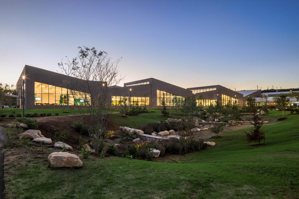 The rooflines of the five structures are the most striking visual element of the campus. From a side profile, the peaks and depressions of the parapets form a series of imposing and concentric gables. Each peak of the gable hosts a yawning sawtooth skylight, which effectively daylights stretches of office space below. On certain elevations, glass is the primary facade element and is framed by narrow bands of the cementitious board. The Solarban 70XL glass, supplied by Vitro, is mounted atop a curtainwall system fabricated by Graham Architectural Products.