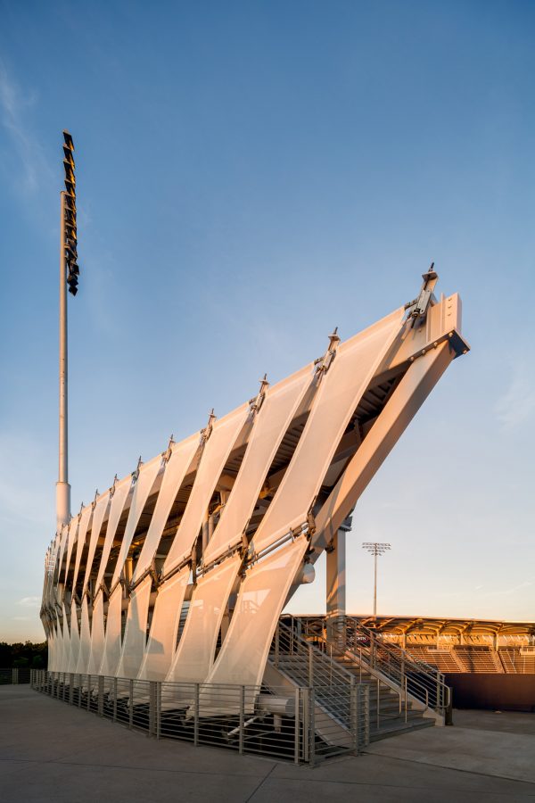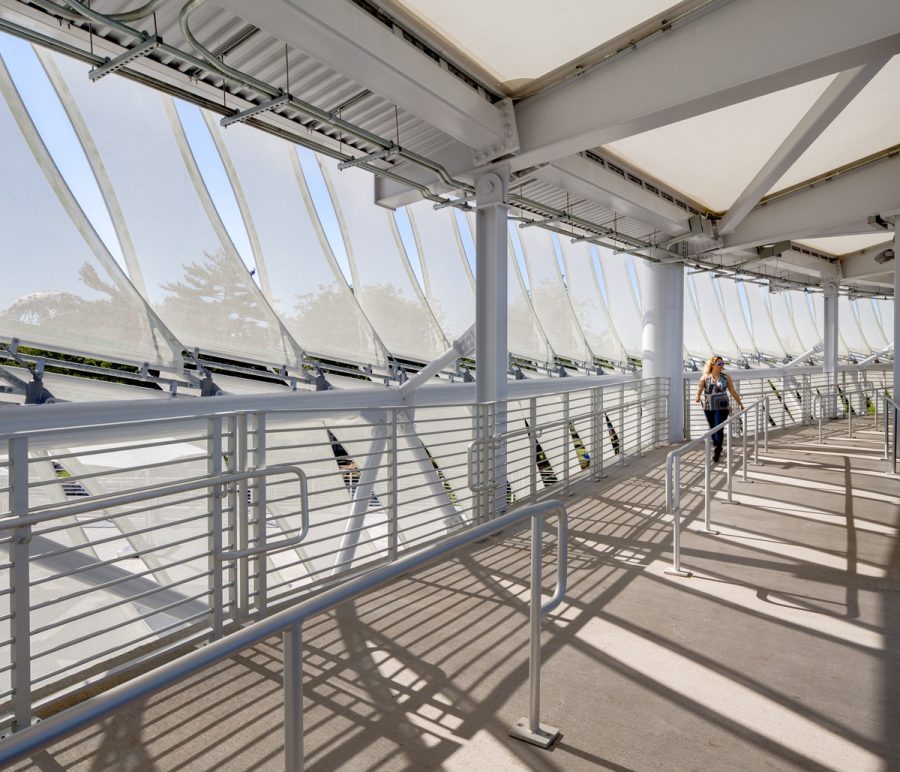 Early on in the process, working with PTFE manufacturer Birdair, ROSSETTI mocked up details using PVC pipes and in-house 3d-printed connection components to test and resolve details in full scale. This became a transportable design, presentation, and technical tool that allowed the connection between the PTFE panel and the steel strut to evolve into an elegant functional expression. Taylor said the mockups led to design changes through a collaborative process between the architect and manufacturer. “Birdair was great to work with—they were up to the challenge of this design.”