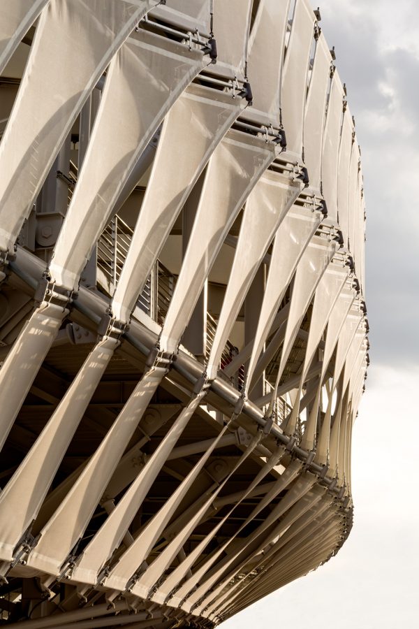 To mediate between this historic park setting and the tennis campus, ROSSETTI designed a unique exterior skin pattern that metaphorically evokes the translucency of leafy tree canopies and the twisting dynamics of the tennis serve. The material selected, a Teflon-coated fiberglass membrane, polytetrafluoroethylene (PTFE), is typically used for roofing applications but in this case, a woven version allows for a more translucent breathable effect.