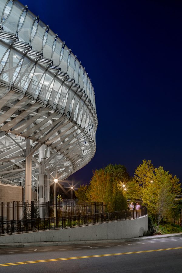 The facade assembly is composed of 486 panels, totaling over 26,000 square feet, that fasten to a cable structure with parametric geometry. The system was designed with computational solver software to streamline design and constructability, ultimately saving an enormous amount of time and money in the project. Matt Taylor, design lead at ROSSETTI, said that early on in the design process, the team tried to mimic the faceted geometry of the structure, by ultimately ended up with a curvilinear form: “Even though this was a very complex facade, we had to simplify it to a point where it was repeatable, structurally feasible, and that the detailing could be economic enough to stay within budget.”