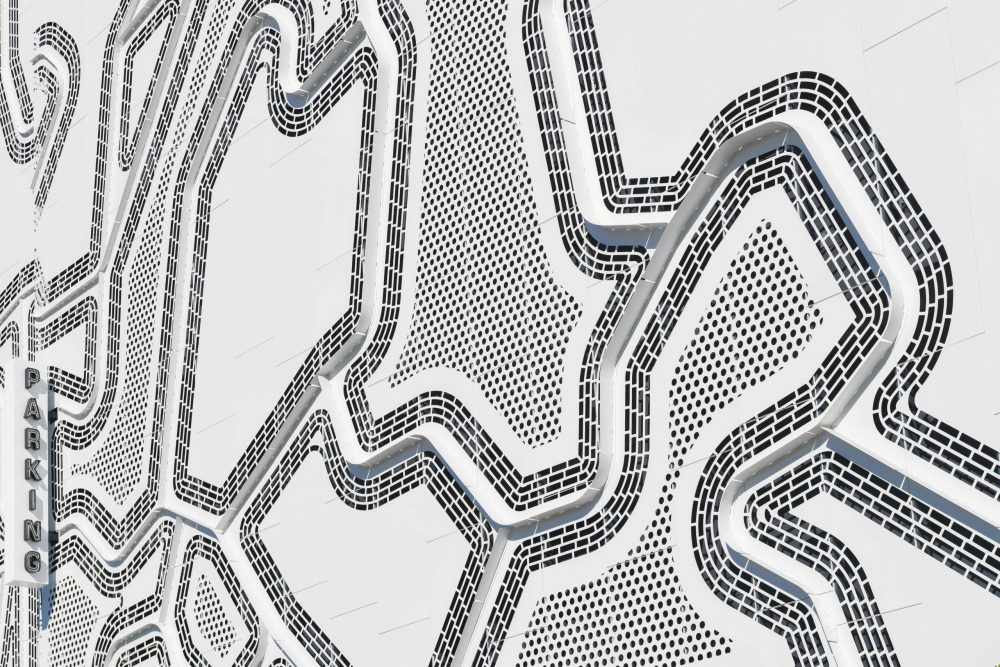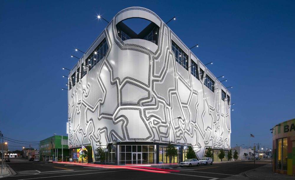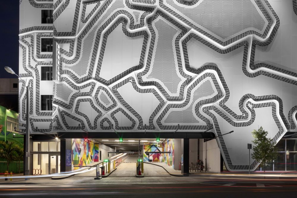 The revival of cities across the United States is fundamentally reshaping streetscapes across the country, with dense developments sprouting from barren lots and pedestrian-oriented spaces usurping what were vehicular realms. In a semi-paradoxical twist, the transformation of the American city has also delivered a reappraisal of the ubiquitous parking garage. And while the aesthetic treatment of parking garages is a nationwide trend at the moment, Miami has proven to be something of a leader in this area with high-design projects led by WORKac, OMA, and Jean Nouvel. The Wynwood Garage, designed by Oakland-based Faulders Studio and Wolfberg Alvarez & Partners, joins this scene with a facade of vividly perforated aluminum.