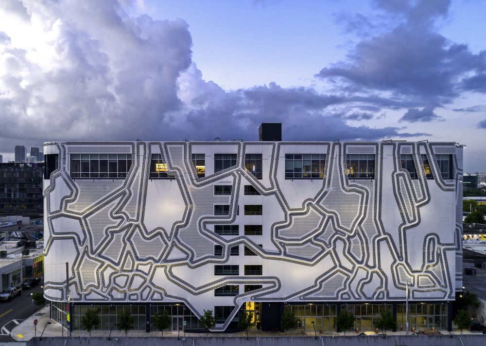 Wynwood Garage rises to a height of eight stories and holds retail spaces at the ground floor, offices on the top floor, and parking sandwiched in between—all together totaling approximately 250,000 square feet.