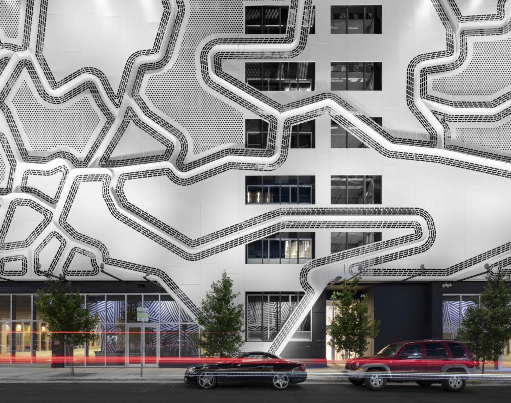 For Thom Faulders, founder of Faulders Studio, the challenge and objective of the project was to enmesh a large-scale architectural intervention within a streetscape and have it resonate locally—the neighborhood is embellished with a range of street murals and still populated by scrappy light industry. “For the building skin I wanted to scramble, re-align, and interrogate the perceived scale of this new large block-sized building,” said Faulders. “Instead of ‘ambiguous functionality,’ where use and program can be open-ended, the facade design relies on ‘functional ambiguity’ to achieve its scale-shifting effects.”