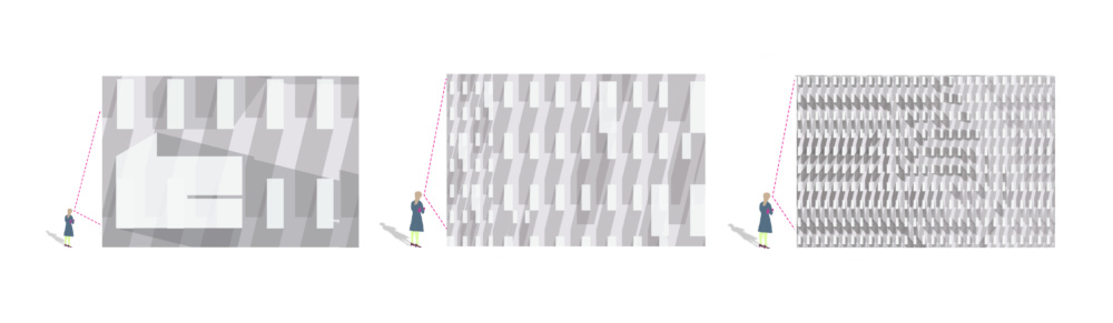 How does the artwork conform to these different scales? The graphics are effectively divided into three separate categories; skyline, street, and reveal views. The pattern across the garage’s 25,000-square-foot facade canvas is relatively constant and defined by rectangular and triangular forms that are linked by diagonal strands of shade, evoking the shadows cast across facades with material depth. From the farthest vantage points, defined as southwest Binney Street and Fulkerson, the graphics are oversized, and, in a certain sense resemble the boxy massing of post-war structures. Shifting to the street reveals views of the enclosure as the gain of the pattern increases in density, leading to a subsequent freneticism in the shading.