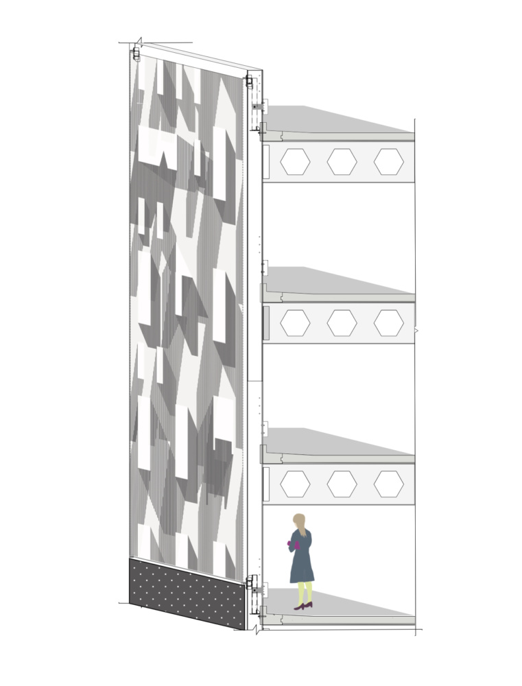The design of the parking garage’s facade was intended to reference the competing architectural scales and functions of the surrounding Kendall Square. The neighborhood, separated from downtown Boston by the Charles River, is defined by newly built tech hubs, residential buildings, and a fading industrial heritage. For the design team, the primary challenge and objective of the project were to break up the monolithic scale of the existing garage—it is eight stories and measures a whopping 350,000 square feet.