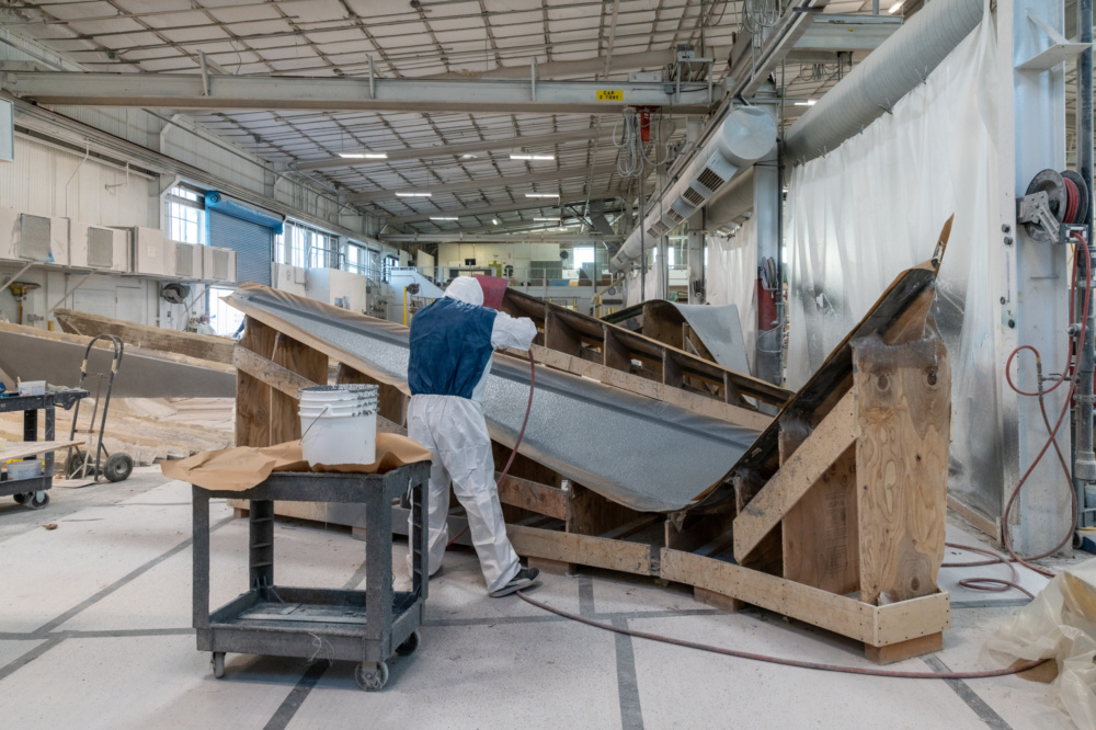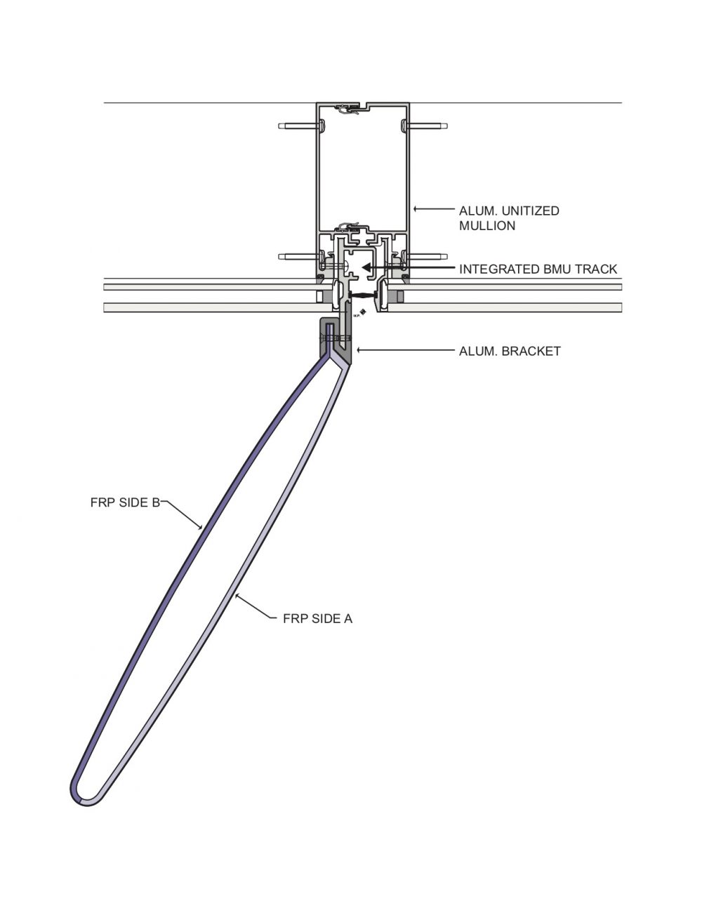 Following production, each FRP hood was transported to the site and attached to each curtain wall module of AGC Interpane insulated glazing units. According to Permasteelisa North America project manager Andrew Harmon, the fabricator and installer collaborated with Gensler and Kreysler & Associates to develop an extruded “Z”-shaped aluminum adapter pre-attached to the hoods during production. “On the job site, Permasteelisa secured the FRP with its adapter to the specially-designed aluminum fins on the curtain wall frame with set screws before installing the units onto the building,” said Harmon. “The FRP hoods can be accessed and removed from the exterior, if necessary, without disturbing the integrity of the building’s envelope or impact its overall performance.”