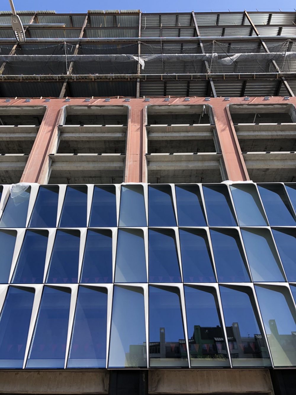 As the decades roll on, public appreciation of post-war office buildings continues to wane, and owners are often stuck with a depreciating asset with poor energy performance to boot. The usual course of action is wholesale demolition and the construction of an entirely new structure on the site. In contrast, a design team consisting of Gensler, facade consultant WJE, environmental consultant Atelier Ten, and facade fabricator and installer Permasteelisa, provides a compelling case for retrofit in the expansion and reclad of 633 Folsom, in San Francisco’s South Market, with a unitized glass curtain wall, and fiber-reinforced polymer sunshades (FRP).