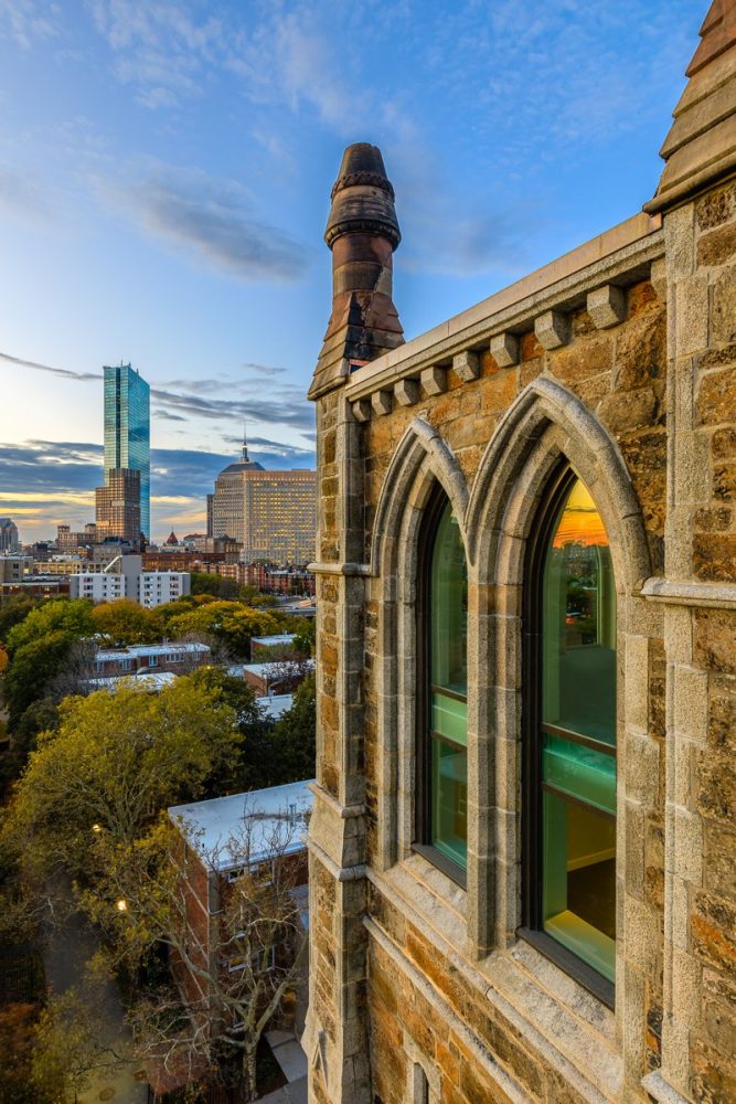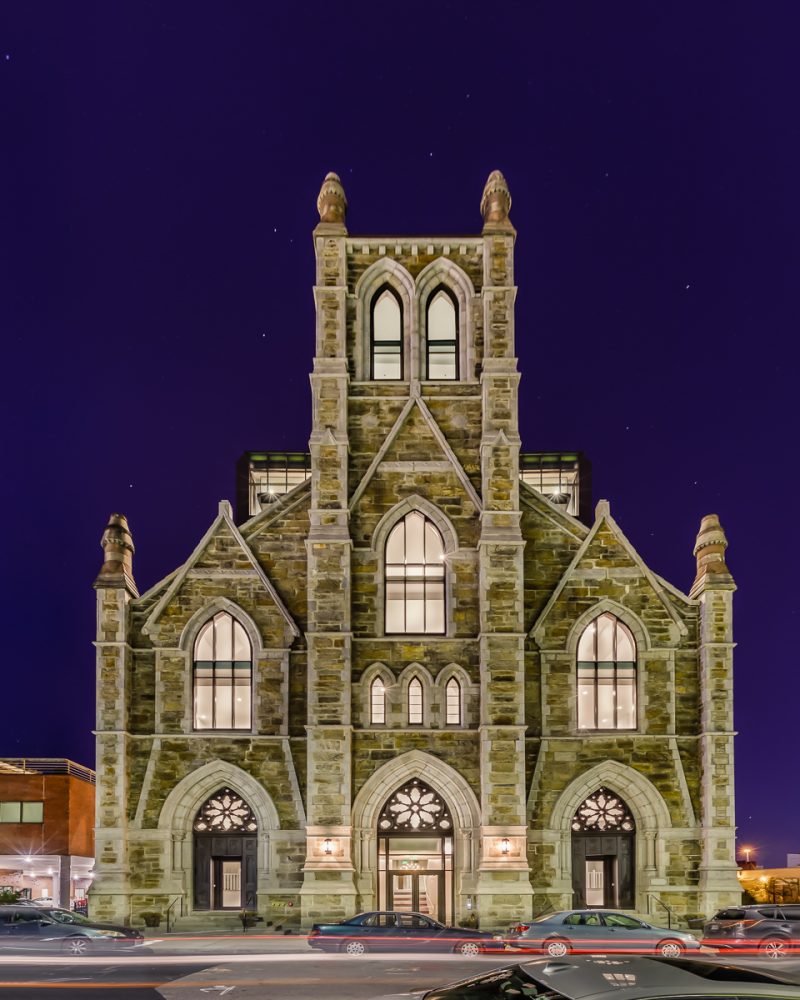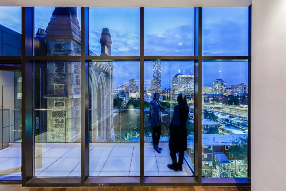 Above the roofline of the original church, the new structure is clad in a simple metal panel rainscreen and curtain wall enclosure. The detailing was meant to be an extension of the historic language of the facade and also create a contemporary interpretation, in opposition to mimicry. The system follows the vertical lines established in the original facade, in both the metal panel and curtain wall. There are vertical fins which jut out over an exterior balcony, reminiscent of the original buttresses but clad in the same metal panel as the rainscreen system and tied back to the new steel structure.