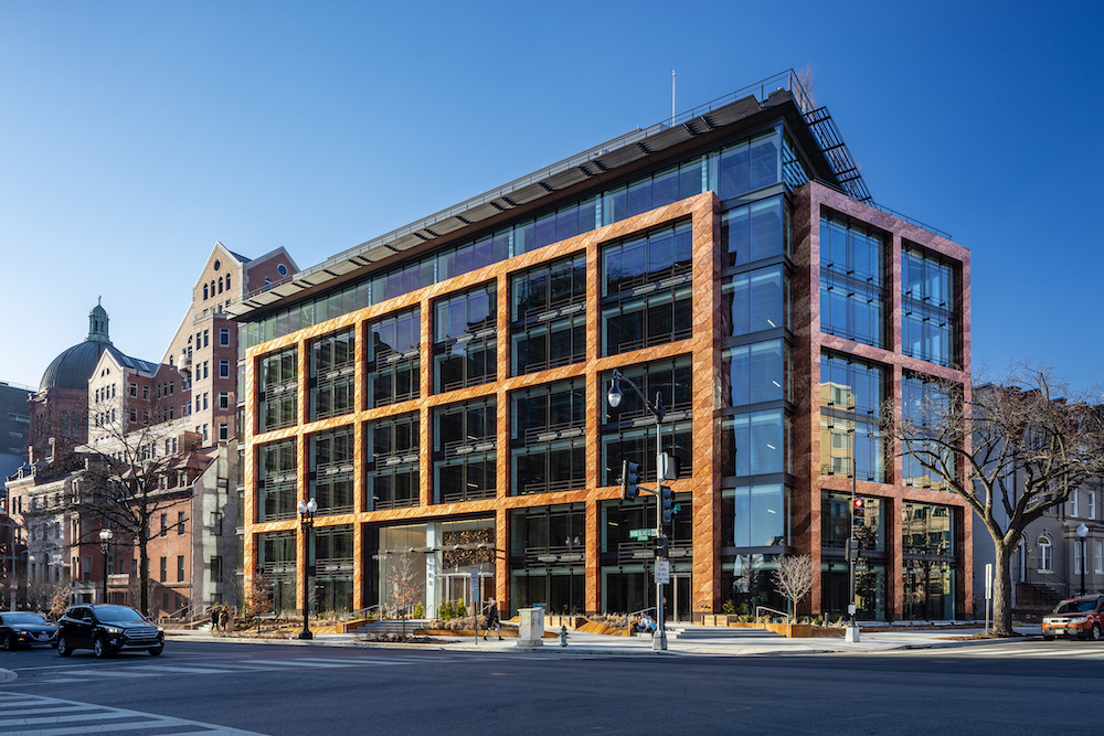 Located in Washington, D.C.‘s centrally located and historic DuPont Circle neighborhood, 1701 Rhode Island Avenue serves as a demonstration of the aesthetic and performative impact of retrofit strategies. The project, designed by local architecture and interior design firm Hickok Cole, is an extensive overhaul of a 40-year-old former YMCA facility into a LEED Platinum Class A commercial structure made complementary to the surrounding streetscape with handcrafted copper shingles and thoughtful detailing of the glazing bays.