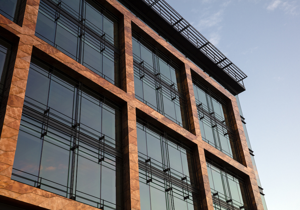 The copper shingles were manufactured by KME Italy, and the design team made several trips to the facility to inspect their varnish—since no two shingles are the same, an acceptable range of treatment was determined by Hickok Cole. Each shingle was treated with a nano-ceramic coating to slow the process of patination. The fabrication process was also something of a tour across northern Italy; the shingles were cut in Parma, varnished in Verona, coated in Venice, and sent back to Parma. Prior to shipment to the United States, the shingles were randomized within their crates to ensure a range of treatments across the building’s facade following installation. Each bay is outfitted with bands of dark-black metal filigrees, which, according to Sani, is a measure to transition between the solid and void of the copper and glazing.