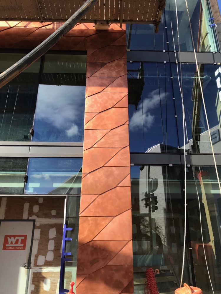 The entire grid is clad with 1,700 copper shingles, which are chamfered at their corners and sequenced from bottom left to top right, thrusting upward 18 inches at each successive layer. Juxtaposed with nearby St. Matthew’s Cathedral and historic structures, the use of copper is a clear nod to traditional detailing. “The facade combines the ancient feeling of copper with a contemporary pattern and layout,” said Hickok Cole senior associate Stefano Sani. “This is supplemented by the fluid geometry of the cladding and it’s hand installation.”