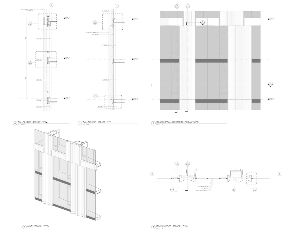 The concave panels and the overall assembly were optimized in collaboration with pre-casters, who helped the architects realize that it would be more efficient to use nine unique panels than the three they initially proposed. Window walls and glass spandrels complete the envelope. The design is more complex than it first appears, with a lot of movement and deflection that required extensive coordination between multiple systems to create the appearance of a single unified building envelope. “Ultimately, we worked out all the details with the help of the pre-caster, the glazier, the facade consultant, and the architect of record, Sasaki,” said principal Eric Höweler. “It’s a very clear diagram, but it turns out that requires a lot of work to get right.”