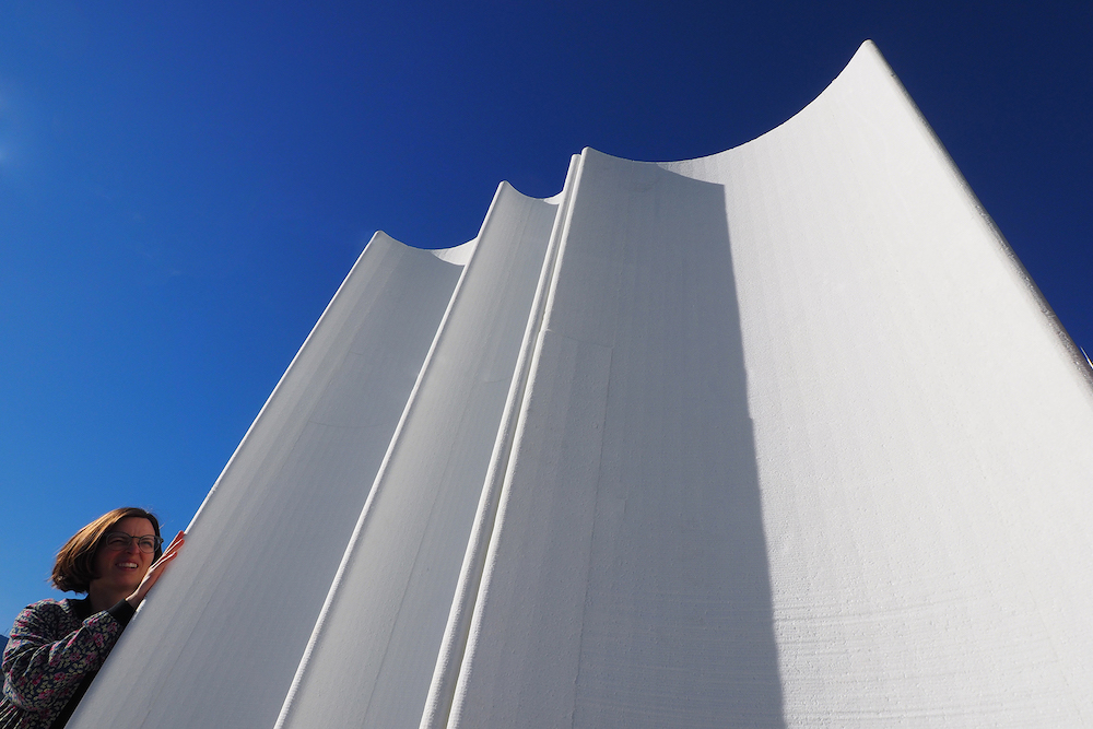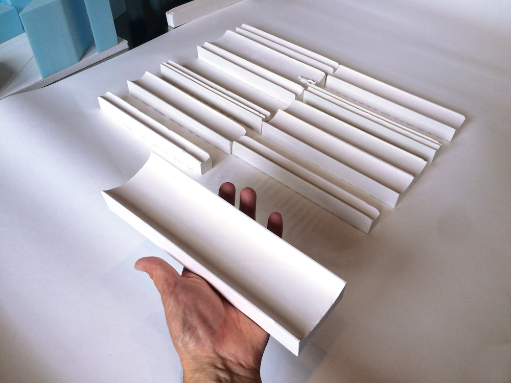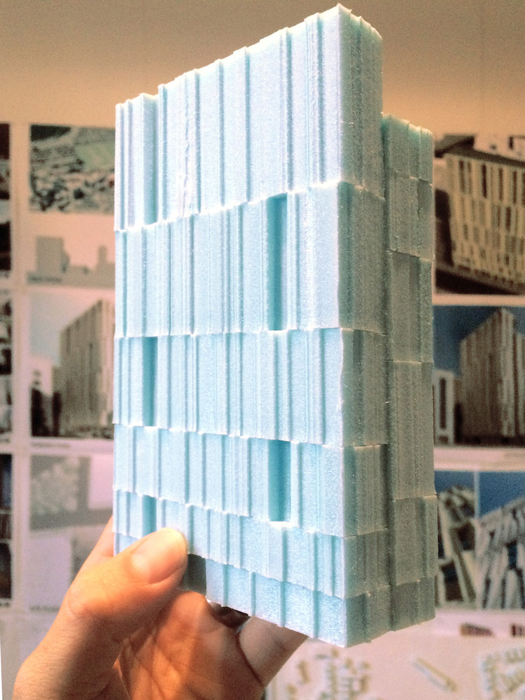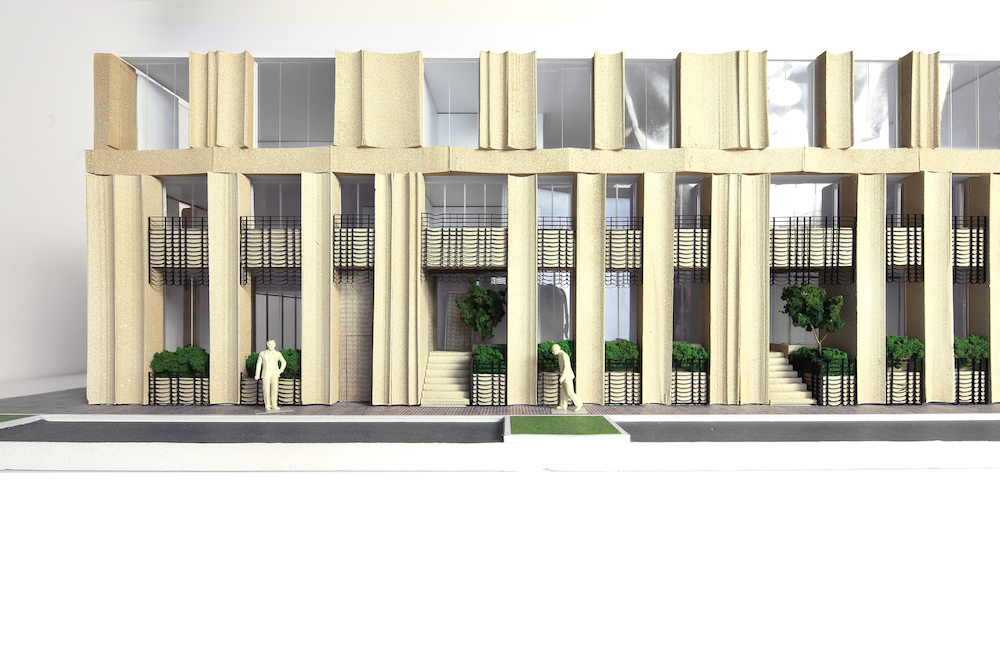 The facade is constructed from 14-inch-thick concave panels whose rhythms produce a dynamic play of light and shadow; there’s a depth and richness to the facade that echoes the surrounding historic architecture. The design was developed and refined over many iterations and with many physical models. The developer-client was won over by the idea with a small plaster prototype of the fluting but was ultimately convinced with a full-scale foam mockup created to study the lighting effects and to better understand how the deep concrete panels would affect the views from the inside.