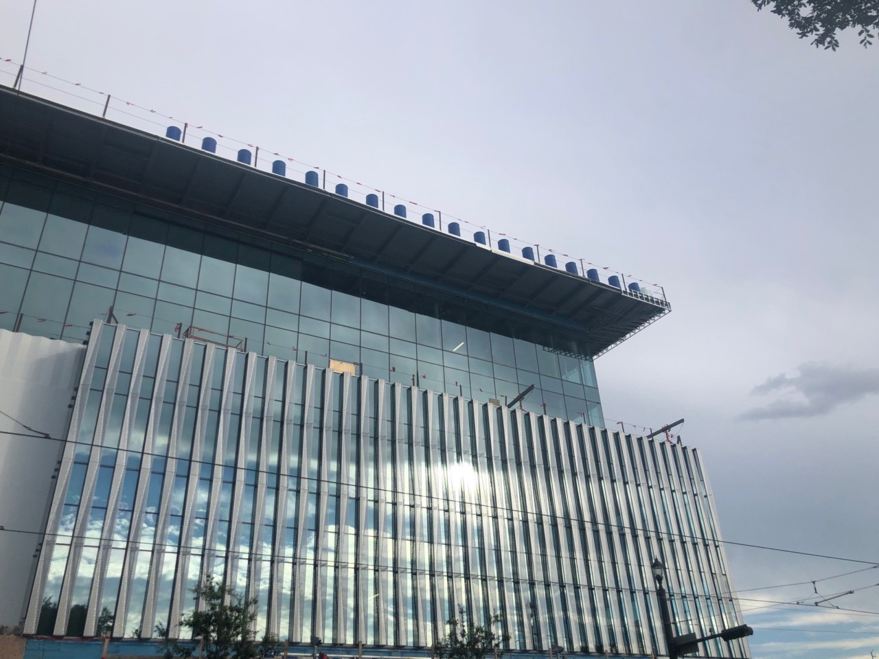 Exterior sunshades ring the new unitized curtain wall system and fold in an energetic gesture between each floor. The sunshades are perforated, and, as a measure to boost iridescence, are treated with two types of fluoropolymer paint; a custom metallic blue on the inward face and metallic silver facing outward.