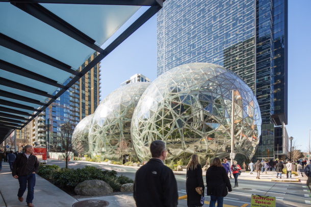 NBBJ designed a trio of connected glass orbs with living walls at the new Seattle headquarters for online retail giant Amazon. According to an announcement on Amazon’s blog, the spherical design—a project seven years in the making—was “chosen due to its natural occurrence in nature and as a nod to historic conservatories, like Kew Gardens.” This atypical meeting place away from the typical office towers provides a treehouse-like environment for employees, complete with terraces, water features, soaring staircases, and wooden decking.