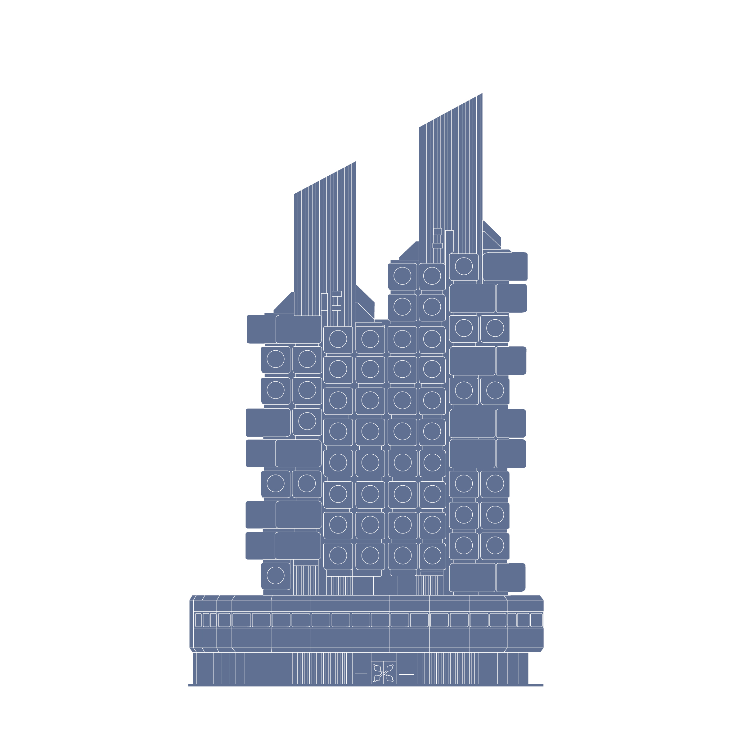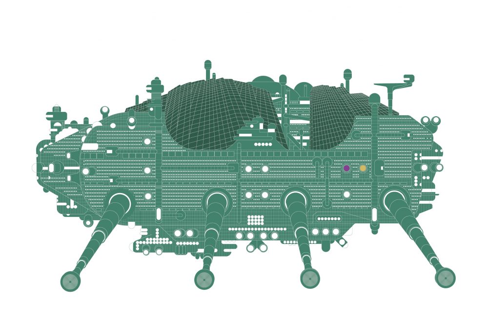 The purpose, or methodology, of the sketches crystallize’s with structures of greater height and asymmetrical massing. Under normal circumstances, one is hard-pressed to find similarities between Giles Gilbert Scott’s Battersea Power Station (1939 & 1955) and Mimar Sinan’s Süleymaniye Mosque (1558). Compressed into a smoothly digestible format, the towering smokestacks bear a similarity to the spiked minarets of Istanbul’s largest mosque, albeit with a boxier and less staggered base. This approach does veer in a slightly different direction with the playfully drawn renditions of Neo-Futurist designs such as Kisho Kurokawa’s Nakagin Capsule Tower (1972) or Archigram’s Walking City (1964).