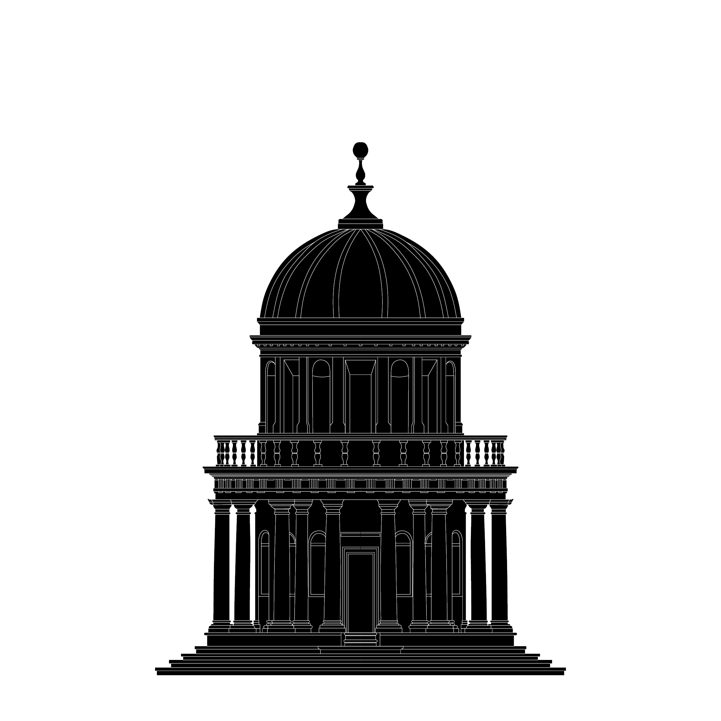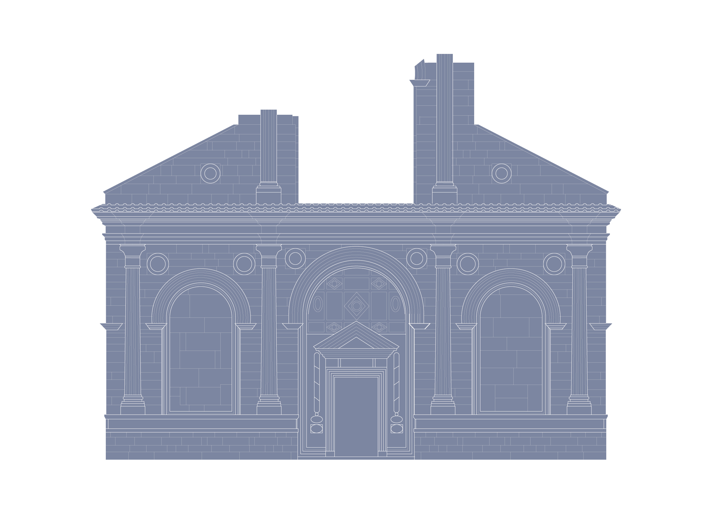 For the sketches, Fankhauser turns back toward Renaissance architecture, with a preference for buildings that began with the facade as an outward projection of the patron or owner’s prestige. Projects sketched by Fankhauser range from the 15th to the 20th centuries. Renaissance works, such as Leon Battista Alberti’s Santa Maria Novella (1458) and Andrea Palladio’s Villa La Rotonda, are simply etched; Ionic, Corinthian, and Doric orders are clearly discernible without the florid animation of flowing acanthus leaves or spiraling volutes. Similarly, the drawings forgo the play of light and shadows that define these Early Renaissance works; porticos, colonnades, and alcoves, are two-dimensional elements of the same shade and color as the rest of the assemblage.