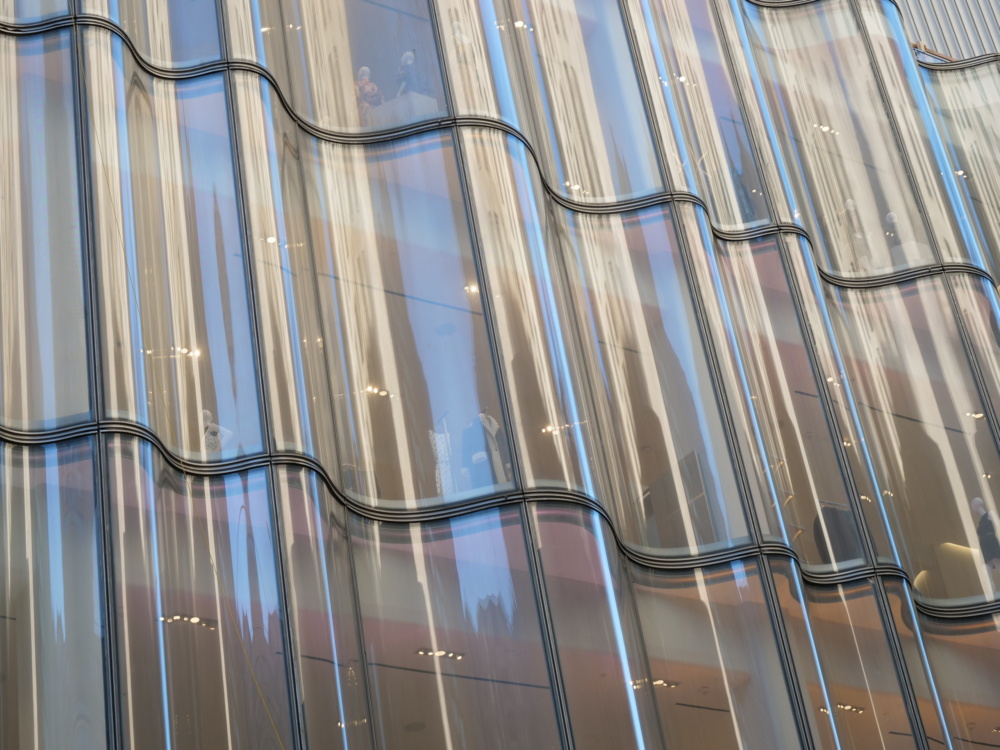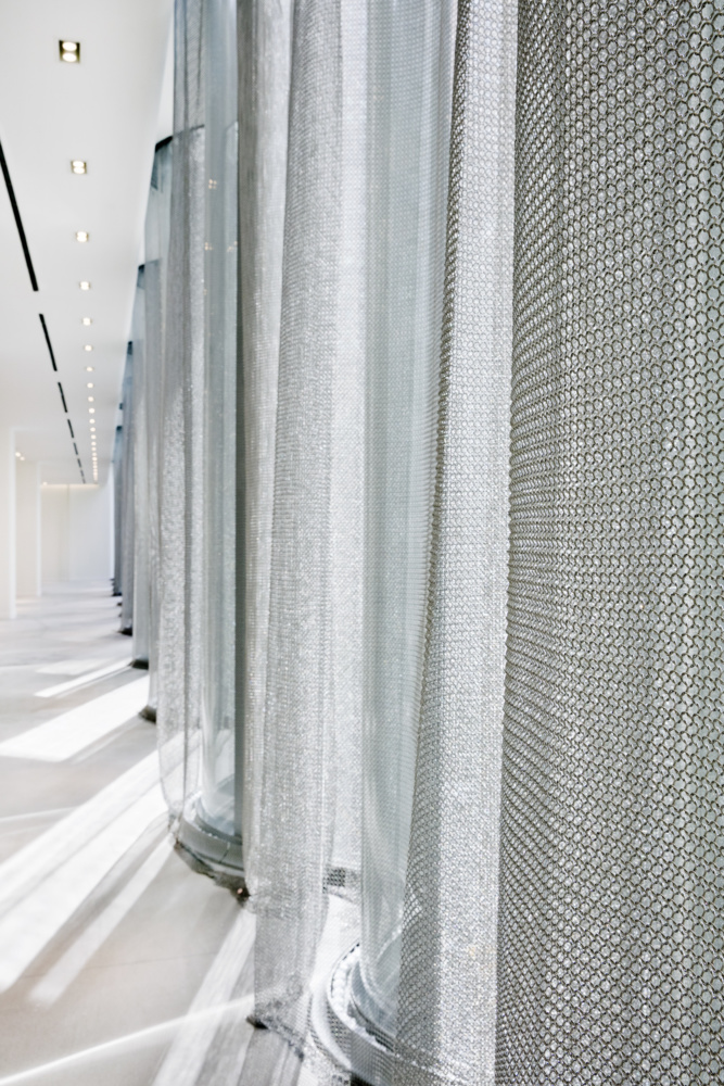 The curtainwall is backed by a diaphanous steel mesh veil, that, similar to the now-defunct pool room of the Mies van der Rohe’s Four Seasons, filters daylight and adds a layer of depth, with shadows and iridescence, to the facade.