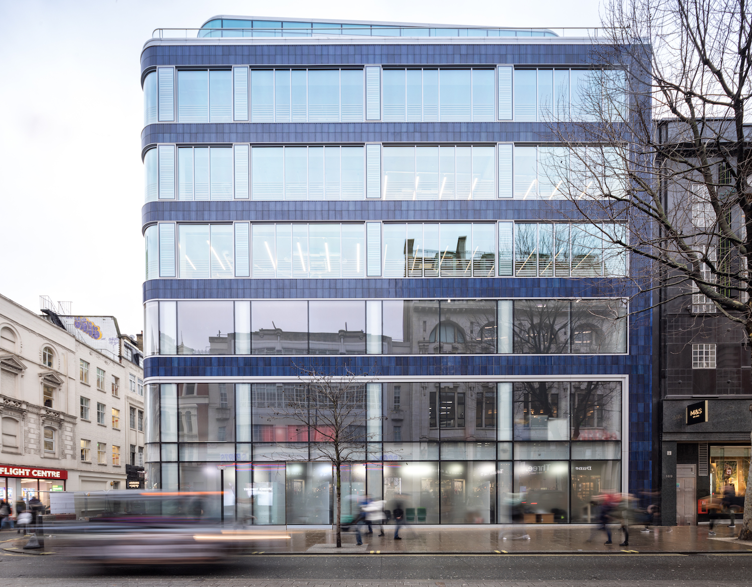 London’s Oxford Street is the primary commercial corridor of the West End, running for a mile between Hyde Park and Tottenham Court Road. A motley crew of architectural styles calls the boulevard home, ranging from the corybantic masonry of the Edwardian era to the streamlined forms of art deco, and, more recently, glaze-heavy modern structures and the overstated expressionism of postmodernism. Such a contradictory setting is rife with opportunities and challenges for any design team, and London’s John Robertson Architects (JRA) embraces that context at the Academy House with a meticulously detailed retrofit of ribbed terra-cotta and ribbons of curved and fritted glass.