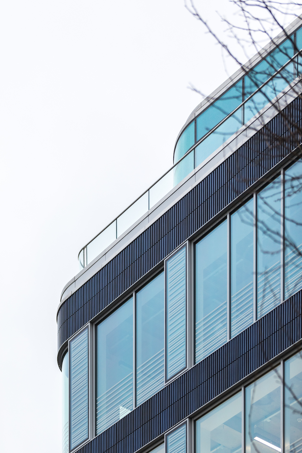 The glass curtain wall was assembled and installed by German fabricator MBM-Dobler, and glazing was supplied by Cricursa and framed by a Schuco facade system. The glass panels come in two sizes; 9-by-8-and-a-half feet for the two-story retail base, and 8-by-5-feet for those above. The ribbons of glazing sweep across the facade, and, notably, are intermittently horizontally fritted to obscure internal columns and are dramatically curved at the intersection of Oxford and Poland Streets.