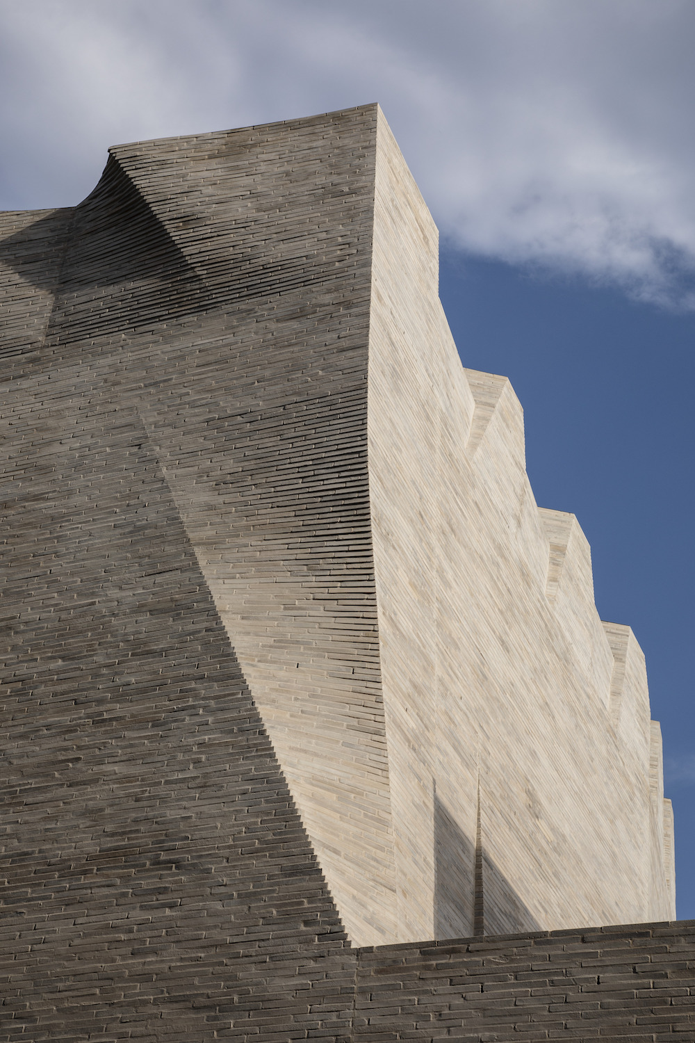 The approximately 13,000-square-foot project was designed by John Wardle Architects and Durbach Block Jaggers Architects and settles into its midblock infill site with an idiosyncratic design composed of a carved and curved mass of light grey handcrafted brick.