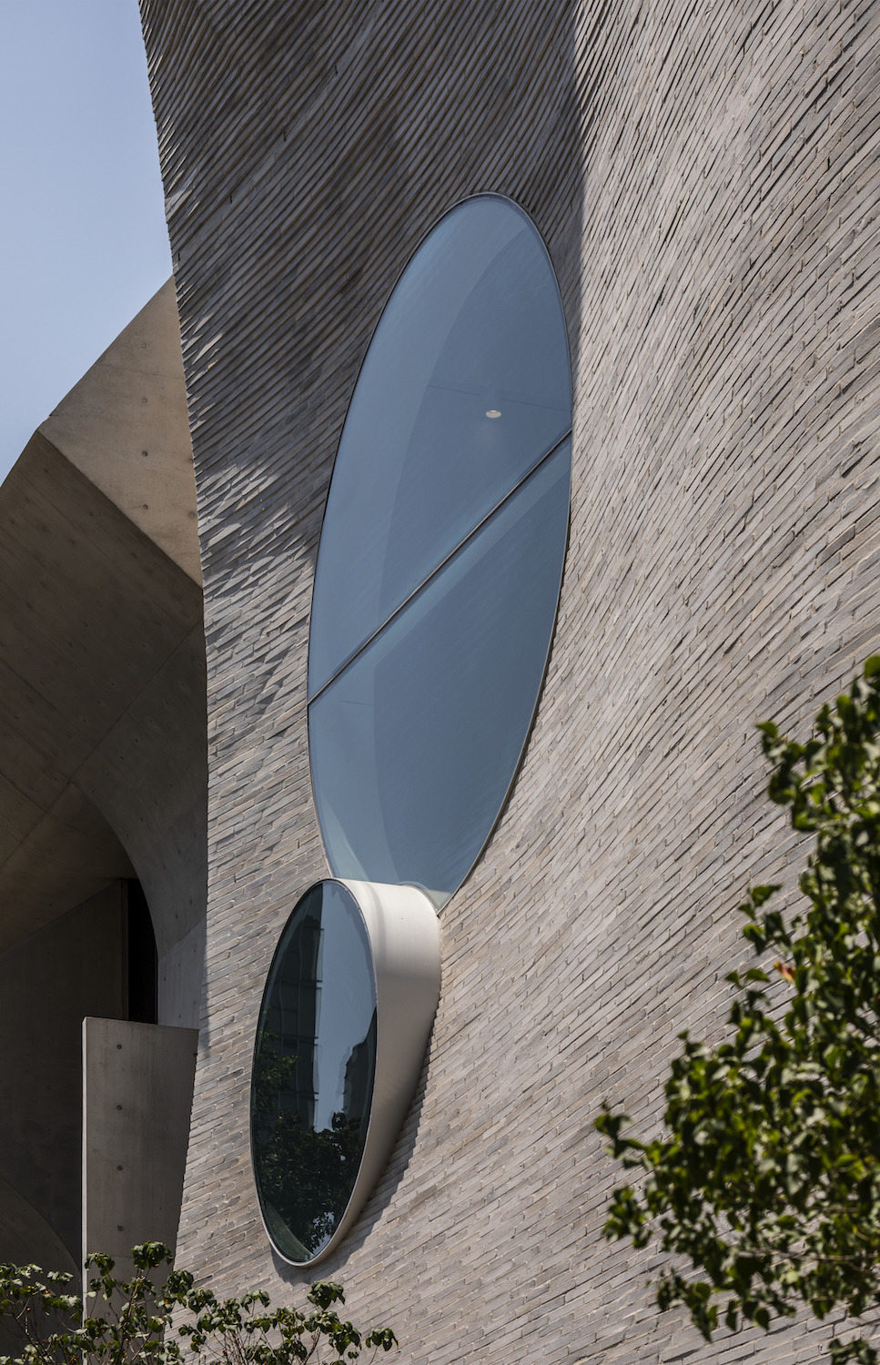 Although the bulk of the facade is opaque, there are several moments of glazing found at the clerestory, and, notably, the coupled oculi found at the streetwall. “The dimple window is a playful expression of droplets of water forming a pool and a depression within a horizontal plane being set vertically. To create this effect, the two rings of glass are inset within the brick surface: it’s as if the brick has been treated as a lightweight fabric and the impression of the windows pushing inwards creates the circular dimple,” continued Wardle. “The windows also align exactly with the street that terminates directly in front of the building, so in a way, they become urban markers that place the building in its location. This idea caused possibly the most complex documentation detail that has ever been undertaken by our practice.”