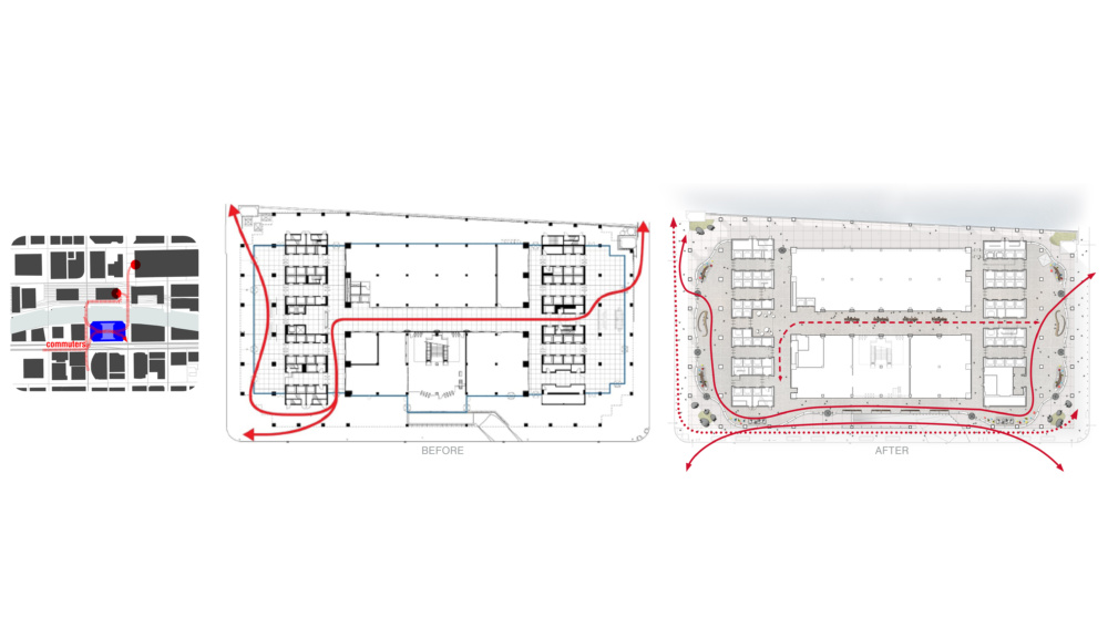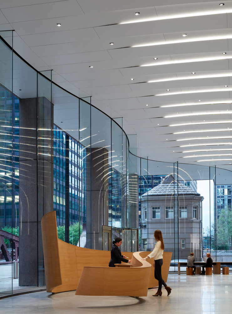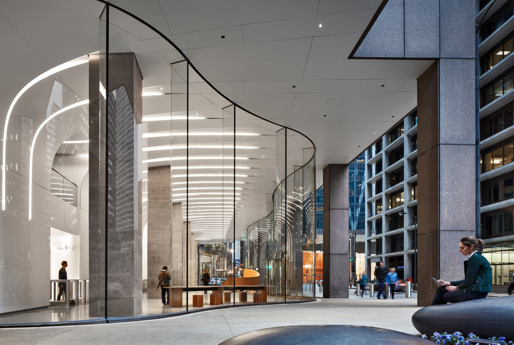 The glass streetwall runs the entire width of the city block, weaving behind the square columns that form an encircling arcade. When developing the overall contour of the glass facade, Krueck + Sexton Architects analyzed the movement of surrounding pedestrians and inputted that information to follow the preexisting desire lines of foot traffic.