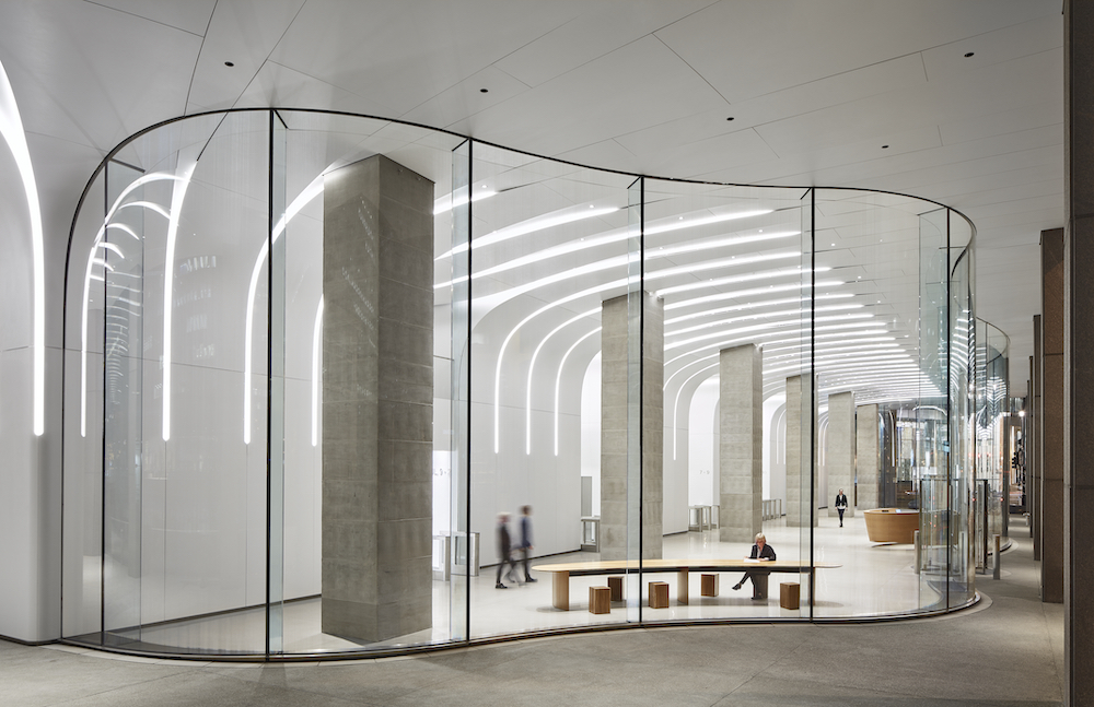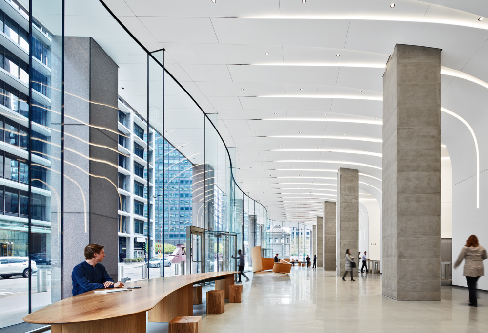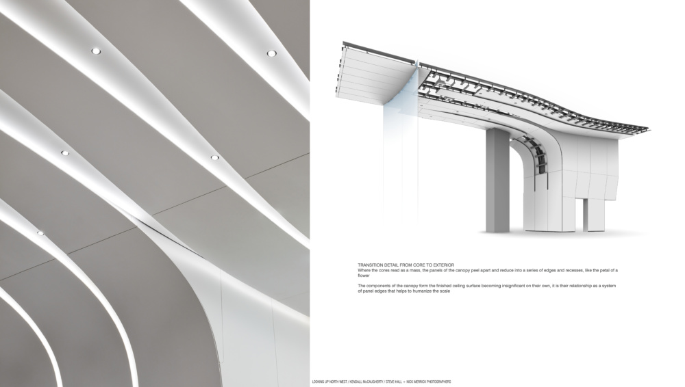 Behind the structural glass facade, Krueck + Sexton placed a sophisticated system of 2,644 white synthetic-mineral panels that rise and curve to form the ceiling and continue outward to roof the arcade. The material is non-porous, allowing for straightforward maintenance.