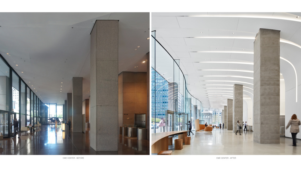 Located on Lake Michigan, Chicago has served as country’s primary inland entrepot for over a century—the Chicago Mercantile Exchange (CME) was founded in 1898. The CME migrated to its current headquarters in 1987, a heavy granite-clad postmodern tower located immediately adjacent to the Chicago River. The design objective of the project was to establish an inviting and prominent facade for a structure in which over 10,000 people cross through daily, replacing 18 separate dark and weighty entrances.