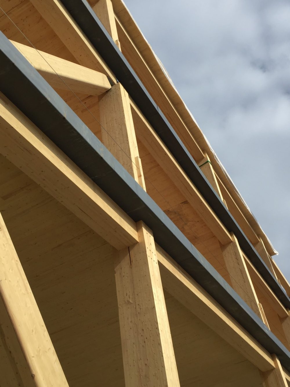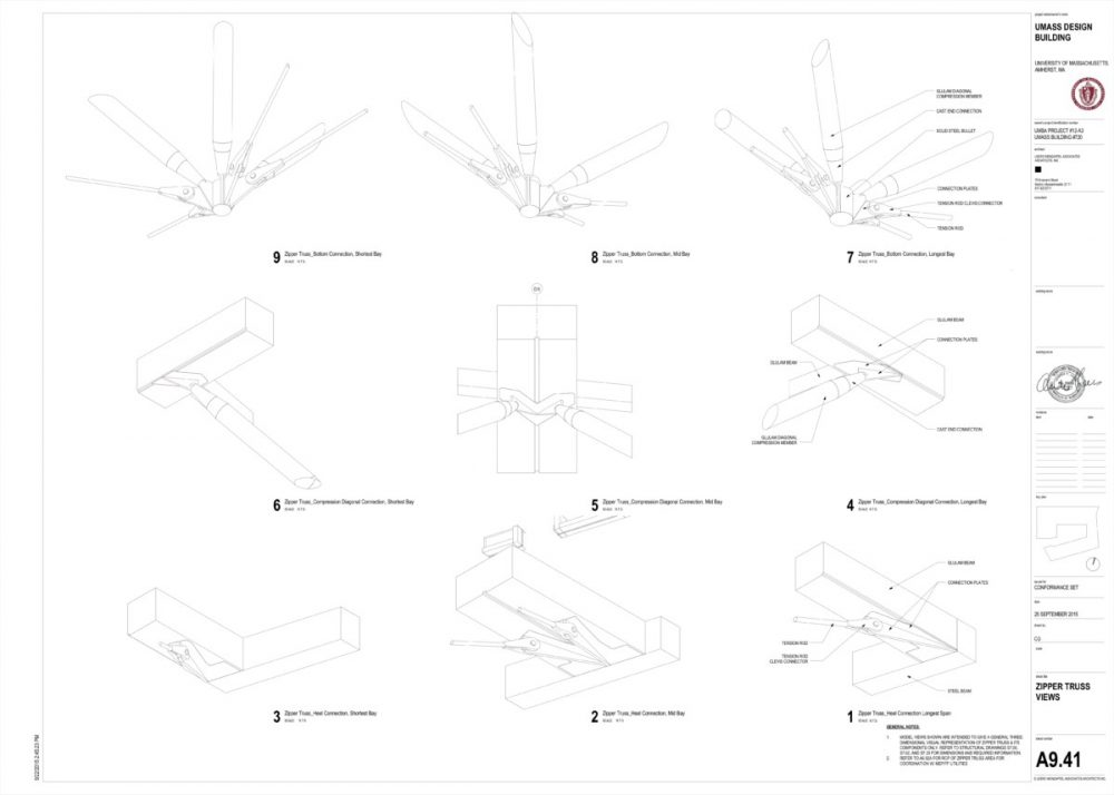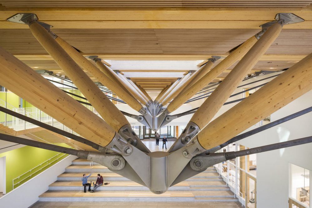 The pièce de résistance of LWA’s design is found at the ground floor atrium where there are seven exposed 12-foot wide and 35-to-60-foot long “zipper trusses” composed of glulam compression members bonded with cast end connections, connection plates, and tension rods.