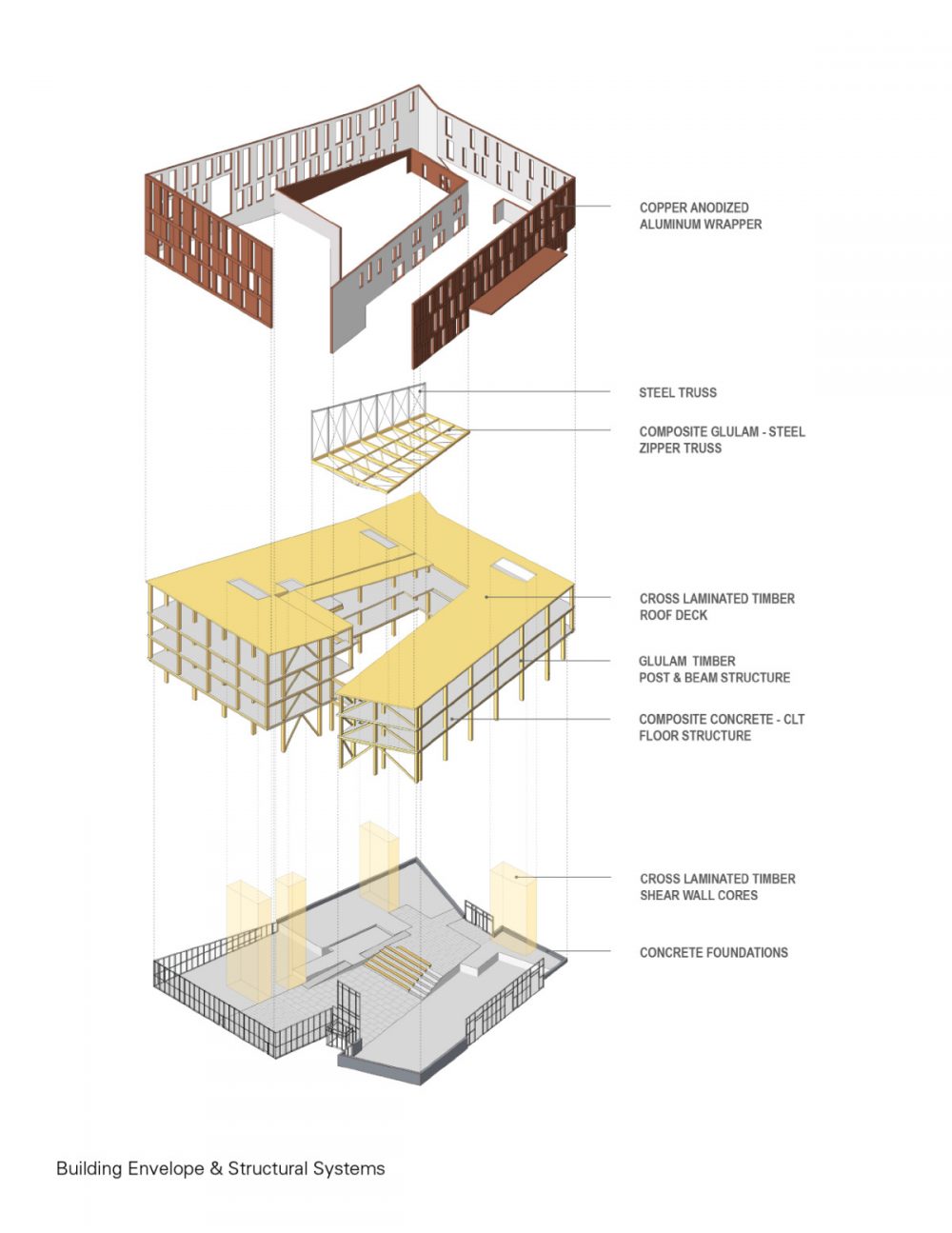 The primary structural system, produced by Quebec’s Nordic Structures and engineered by Equilibrium Consulting and Simpson Gumpertz & Heger, is built of exposed glulam columns and beams, which are supplemented at cantilevers and transfer beams with steel framing. A hybrid approach is similarly applied to the floor plate where the CLT panels are outfitted with perforated metal strips that bond to a top layer of four-inch-thick concrete. The purpose of mixing materials is to blend the tensile strength of timber with the compressive of concrete. Lateral loads at the building’s corners are addressed with CLT shear wall cores and glulam bracing.