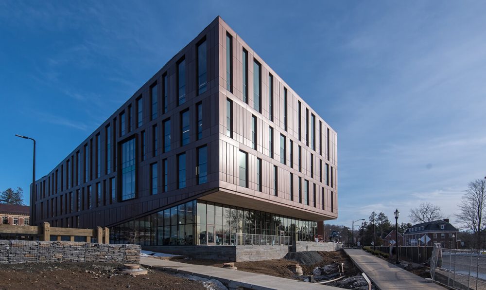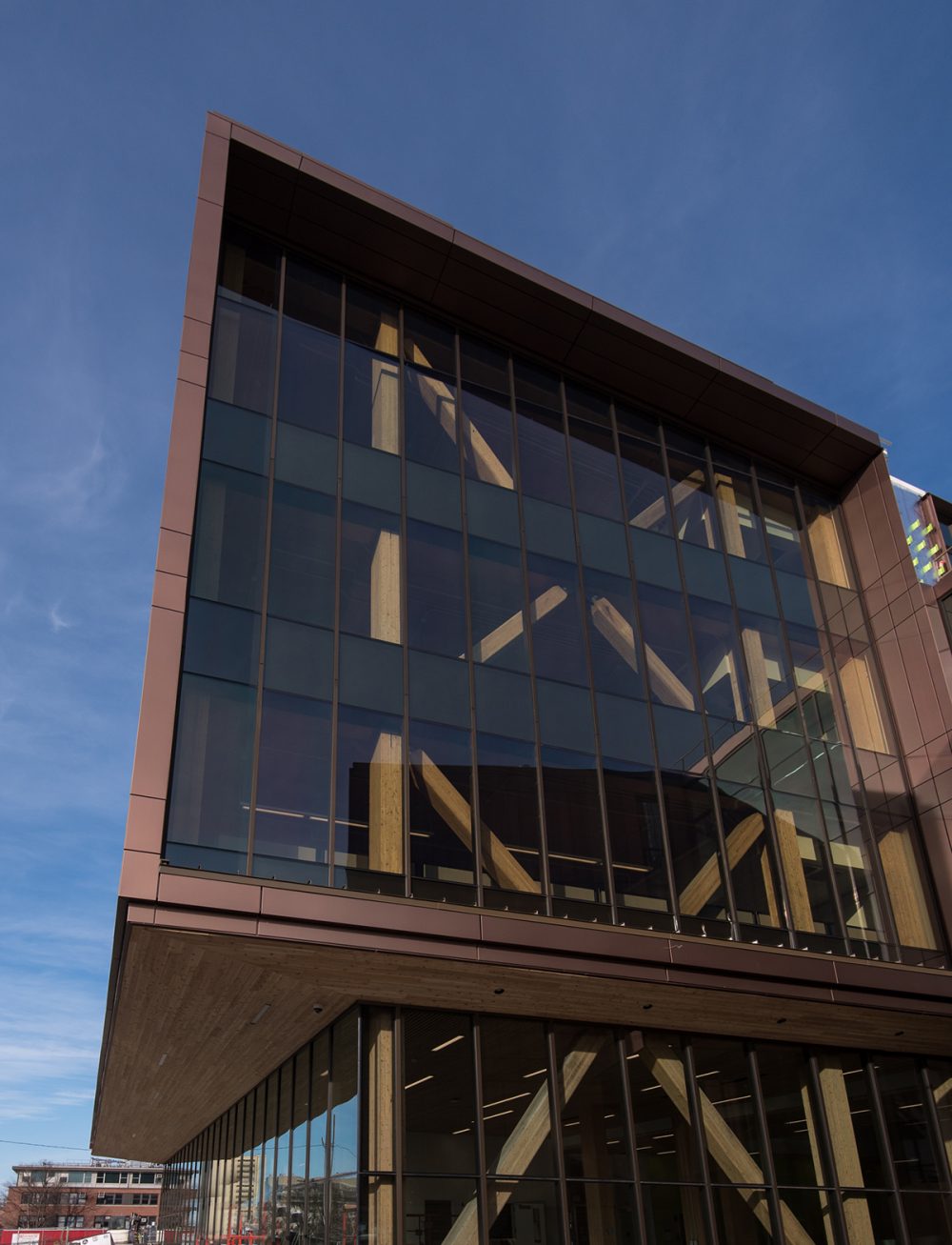 Mass timber projects are sprouting up across the United States. From the Pacific Northwest and to the Southeast, timber buildings are growing in scale and complexity. Designed by Boston-based firm Leers Weinzapfel Associates (LWA), the John W. Olver Design Building at the University of Massachusetts Amherst, is an examplar of that trend with a cross-laminated timber (CLT) floorplate and glulam frame clad with a facade of copper-anodized aluminum panels.