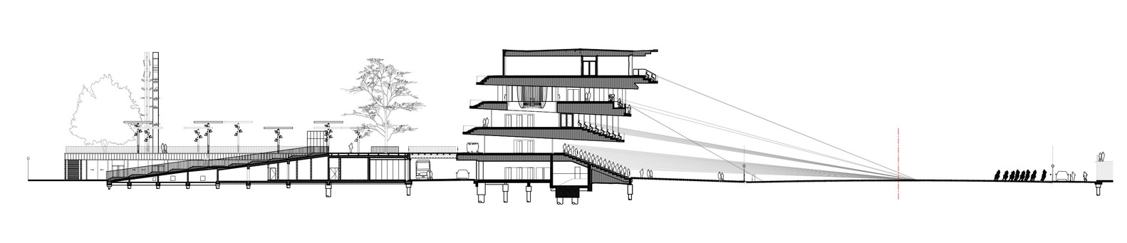 The massing of the grandstand is meant to represent the motion of a galloping horse: the top floor dramatically cantilevers 65 feet over a steel-and-concrete console and inclines toward the adjacent racecourse. With open-ended terraces—referred to as “transparent shelves” by DPA—and a design that faces outward, the crowd is afforded vistas of the stables below and the city beyond.
