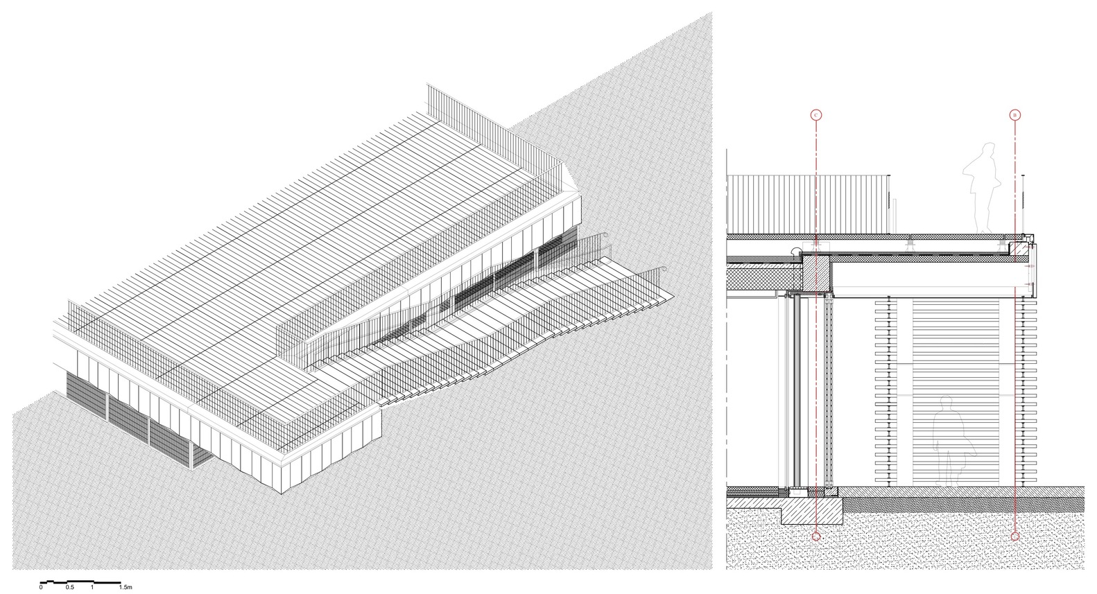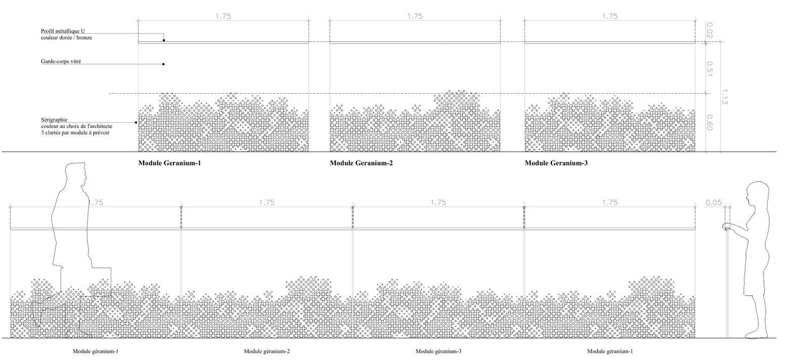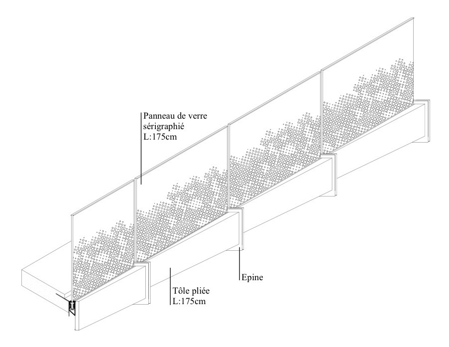 Glass panels, measuring approximately six feet in width and four feet in height, line the grandstand as a semi-translucent balustrade. To ensure visibility of the racetrack for the audience, glass manufacturer and glaze specialist Saint Gobain provided low-iron SGG Diamant panels, facilitating greater light transmittance and minimal green tint. The panels were screen printed with pixelated patterns evoking foliage across the facade.
