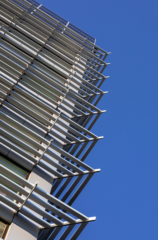 “We designed the sunshades to wrap around the entire glazed portion of the elevator lobby from very early in the design phase, and sized them so that they would shade a majority of the floor-to-ceiling glazing during peak sun hours in the hottest months of the year,” said the MAP design team. “We typically work these calculations out through drawing sections, calculating the angle of the sun at several points in the year, and sometimes with schematic sun studies.”