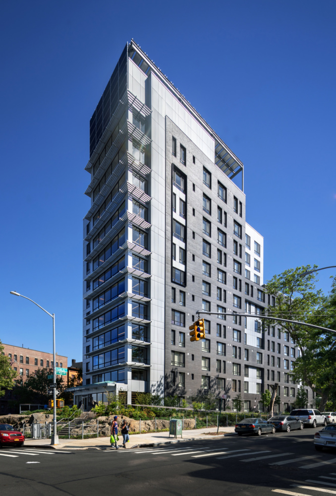The design and construction of affordable housing in New York is a formidable task; between labor and material costs, and the hurdles of municipal zoning and housing regulation, even the grandest of projects are budget engineered into imitations of the original concept. Magnusson Architecture and Planning’s (MAP) St. Augustine Terrace, a low-income residential tower located in the Bronx, challenges that trend with a thoughtful design consisting of dark brick and matted aluminum composite panels.