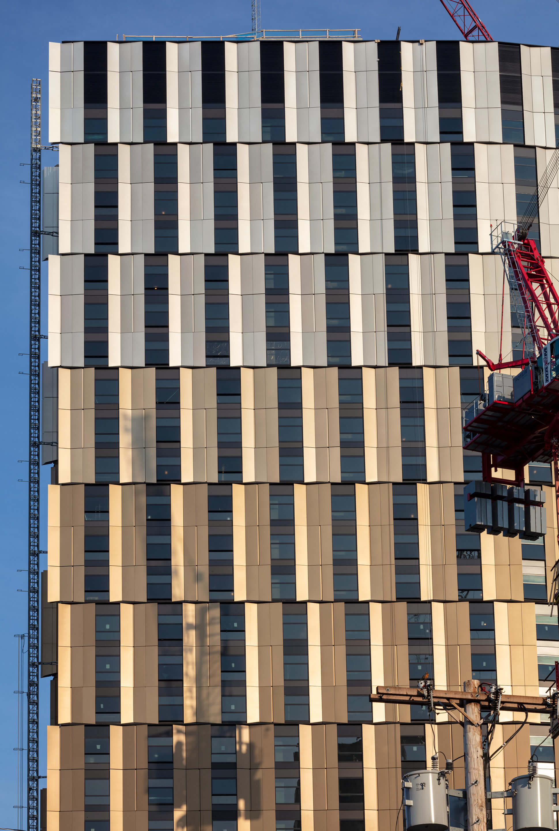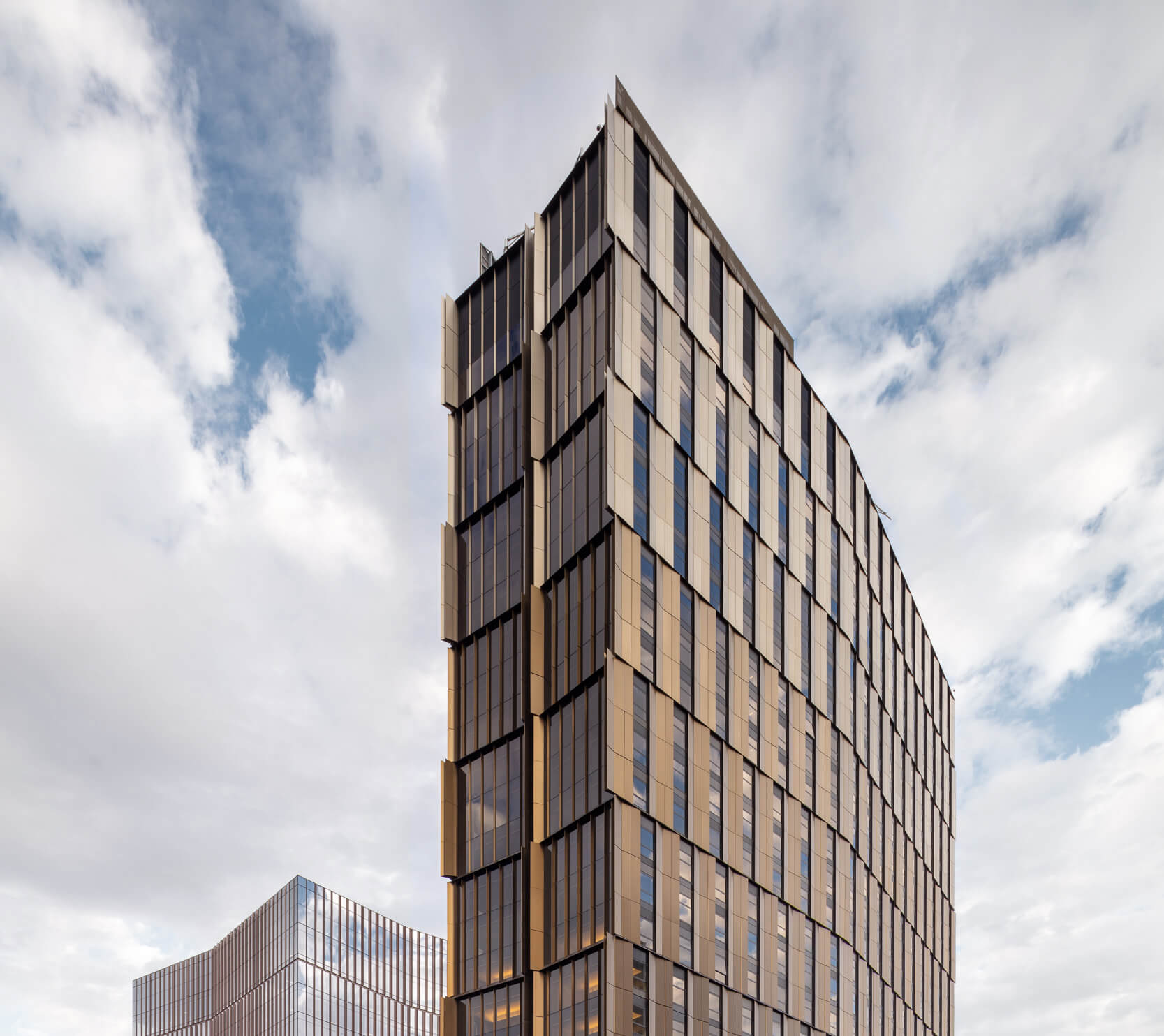 As it takes on increasingly bigger commissions, Boston-based NADAAA has reconciled craft-forward thinking with the economies of scale expected of most large job sites. At Site 4, the aluminum panels are enormous—each is 10 feet tall, anywhere between 15 and 29 feet wide, and weighs 4,200 pounds—yet they are arranged like courses of masonry. Pushing the comparison further, they dagger at the tower corners like coppery quoins.