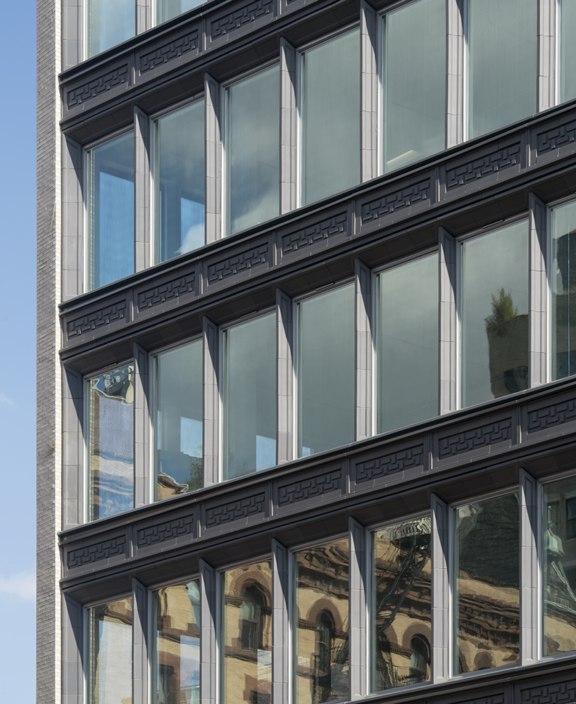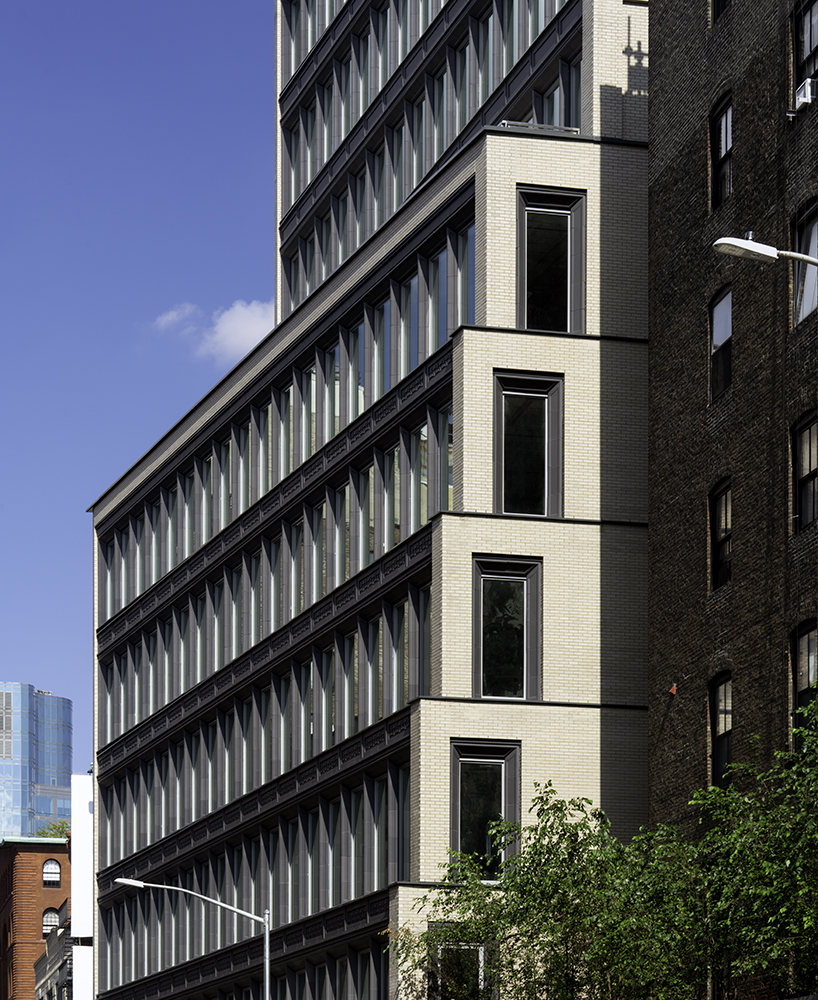 The development’s facade is defined by horizontal and vertical bands of white brick, produced by Belden/Tristate Brick, which frame a charcoal-colored terra-cotta curtain wall. For the color scheme and materiality of 363 Lafayette, Morris Adjmi reinterpreted the area’s historically narrow terracotta mullions, window surrounds, and brick piers, into a much wider layout. Designed by the firm and crafted by Buffalo’s Boston Valley Terra Cotta (BVTC), the geometric pattern of the terra-cotta reliefs was conceived by the design team as an abstraction of neighboring Classical and Richardsonian Romanesque detailing.