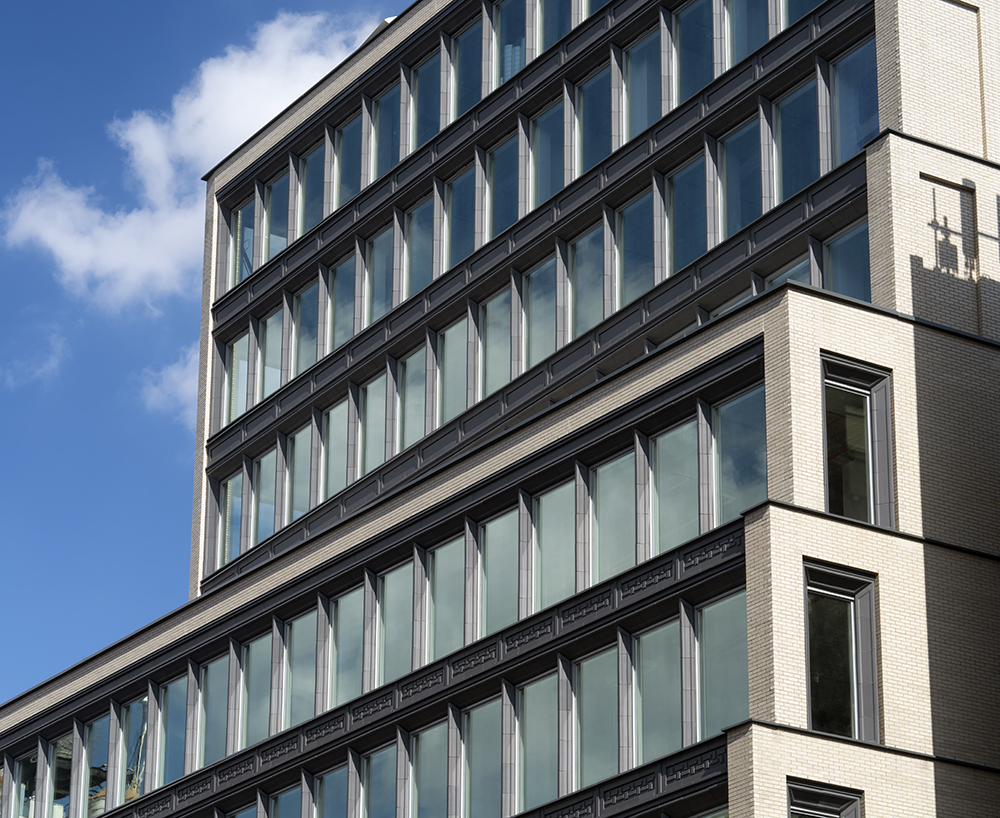 The custom-made terra-cotta rainscreen was installed on BVTC’s TerraClad clip system that attaches to a perimeter concrete beam and a medium-gauge framing wall. A series of gaskets and isolators allow the system to adjust to thermal expansion while reducing wind-induced vibration. Elongated rectangular windows, fabricated by TriStar with Win-Vent frames and Vitro Glass, are placed between chamfered terra-cotta mullions.